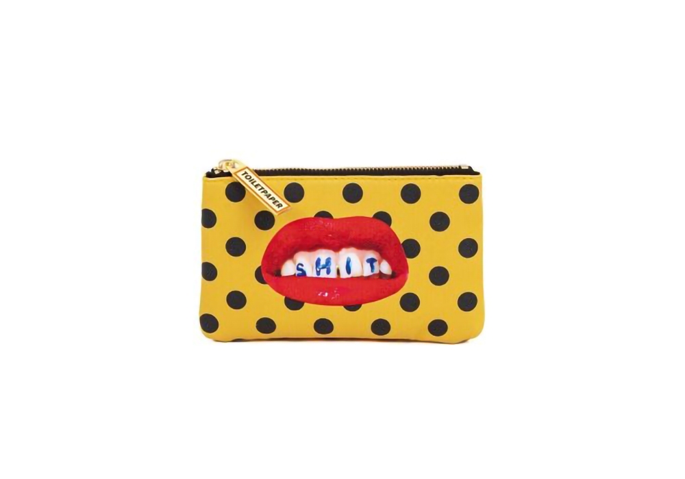 Shit von Toiletpaper Magazine für Seletti entworfen ist ein Mäppchen mit Reißverschluss aus gelbem und schwarzem PU-beschichtetem Polyester mit farbigem Aufdruck.