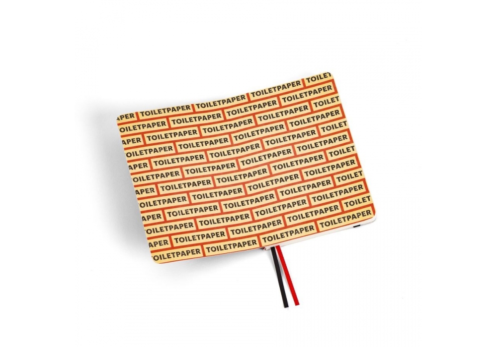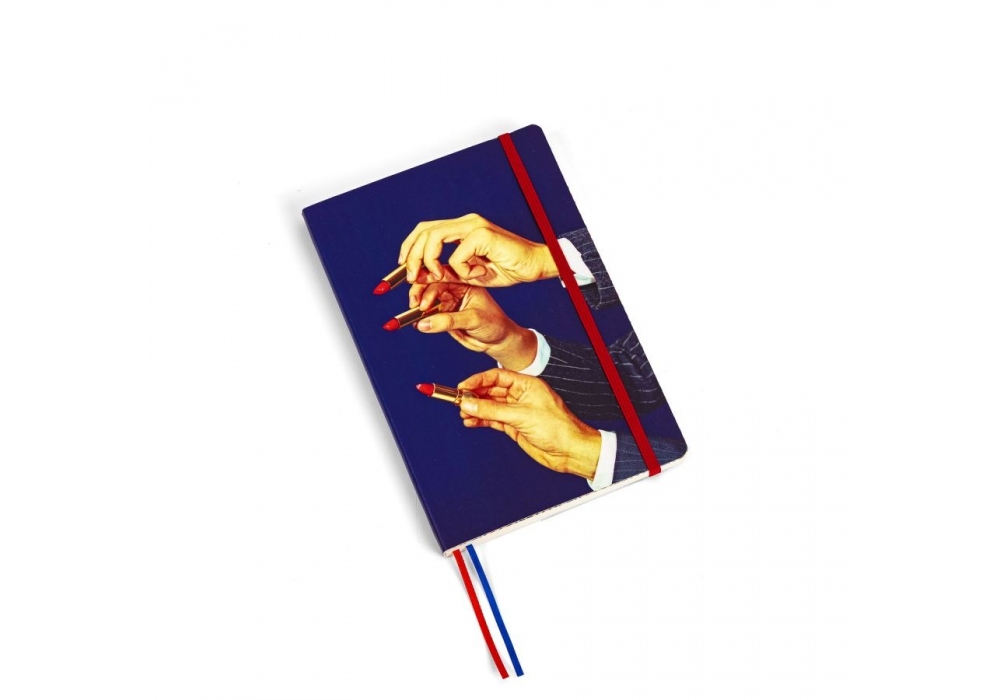 Lipsticks entworfen vom Toiletpaper Magazine für Seletti ist ein Notizbuch mit einem Einband aus PU-beschichtetem Papiermaterial mit blauem Hintergrund und farbigen Markierungen. Die Innenblätter bestehen aus elfenbeinfarbenem Papier.