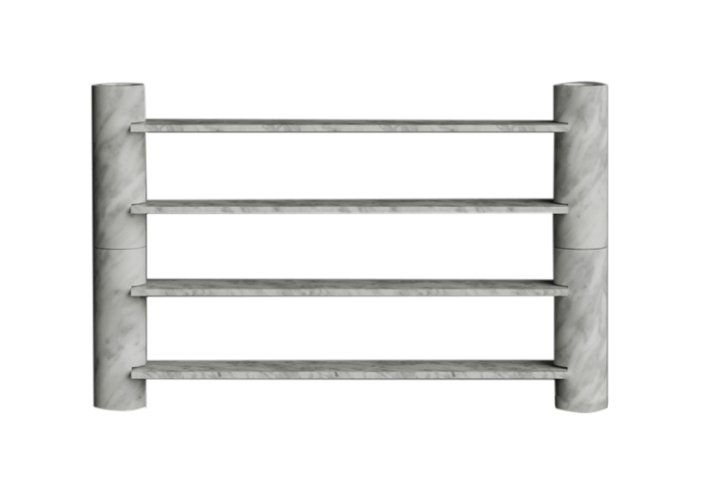 Loico von Angelo Mangiarotti für Agapecasa entworfen, ist ein modulares Bücherregal aus Marmor in verschiedenen Ausführungen. Es zeichnet sich durch zylindrische und stapelbare tragende Elemente und Regalböden aus, die in den entsprechenden Gelenken befestigt sind. Die Regalböden sind an der Unterseite mit Kohlefasergewebe ausgestattet, das eine strukturelle und Sicherheitsfunktion hat.
