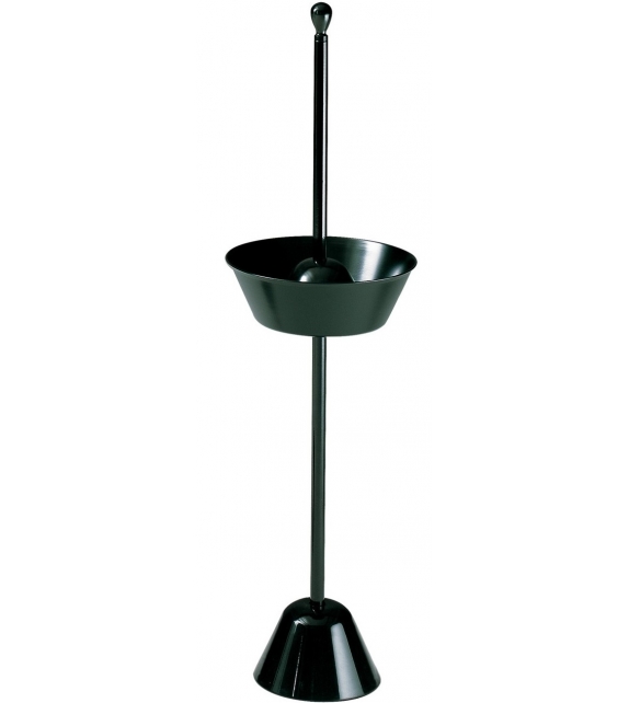 370 Servofumo von Achille & Pier Giacomo Castiglioni für Zanotta ist eine Standascher mit Fuß aus Polypropylen, Behälter aus Aluminium und tragendes Gestell aus Stahl, schwarzfarben.