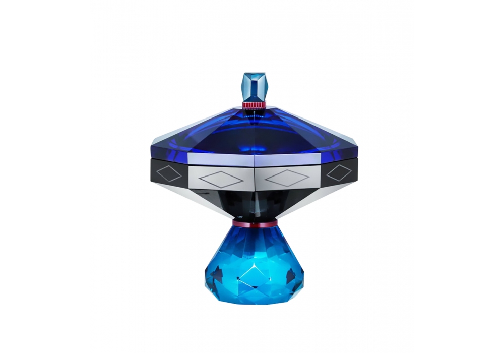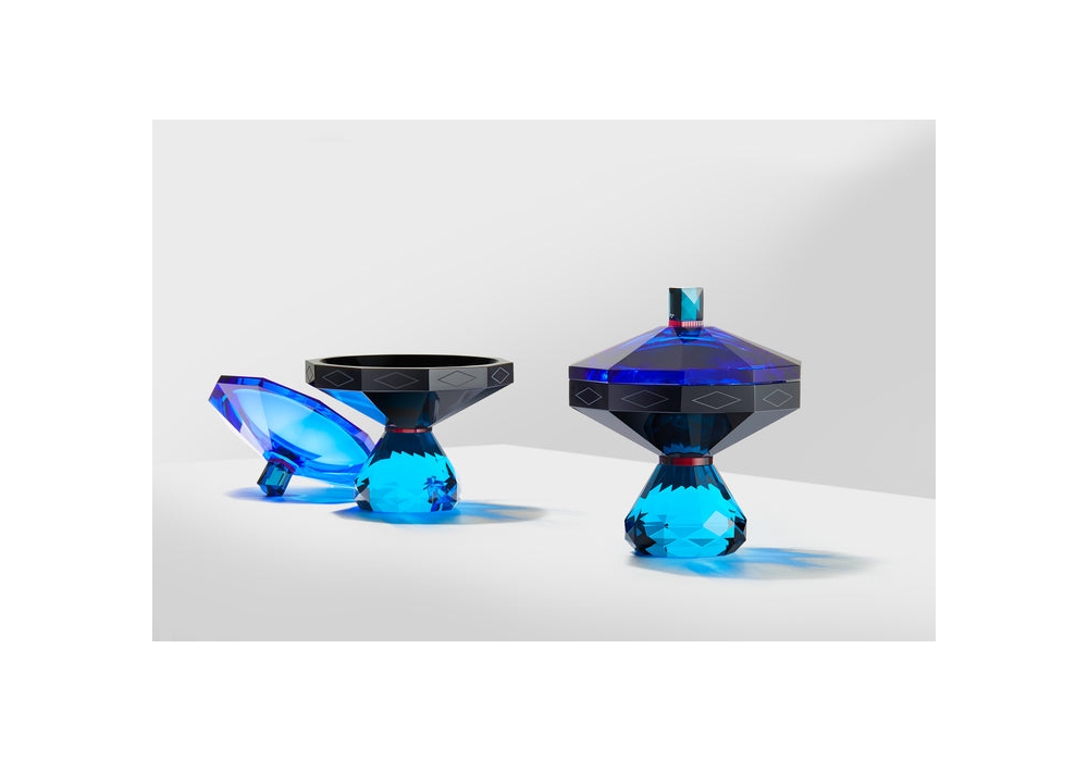 Hamptons Bonbonniere entworfen und hergestellt von Reflections Copenhagen, ist eine Schmuckschatulle aus Kristall, die mit verschiedenen handgeschnitzten und handbearbeiteten geometrischen Elementen in Kobalt, Schwarz, Fuchsia, Saphir und Hellblau strukturiert ist.