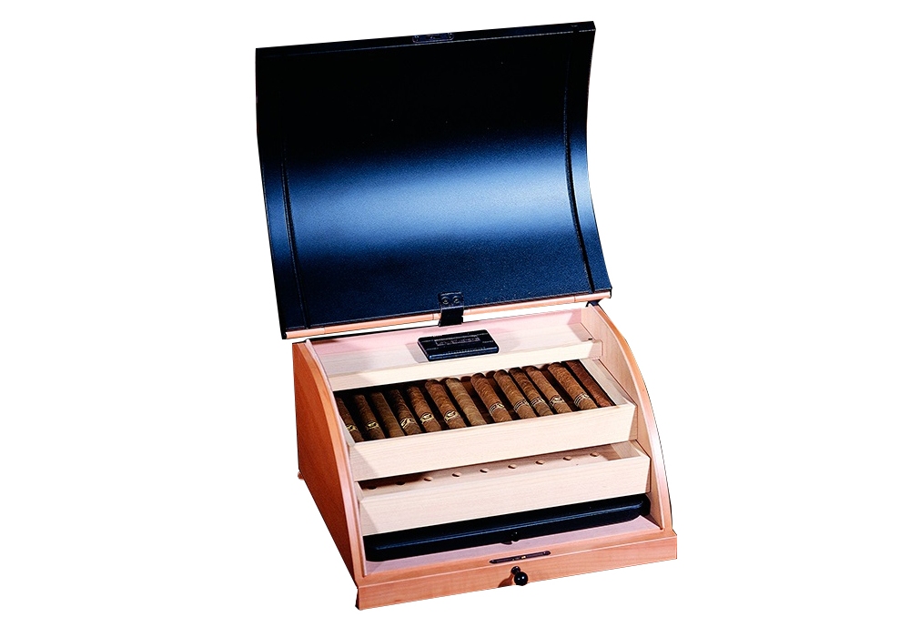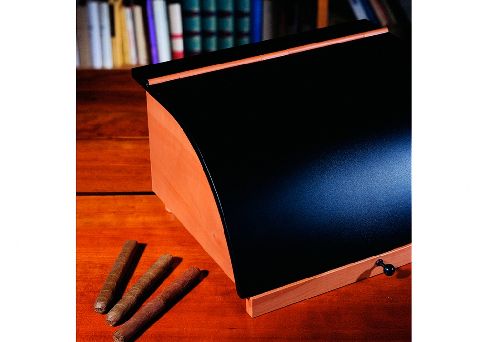Francesco von Barbero Design für Progetti entworfen, ist eine Zigarrenschachtel mit 4 Schubladen, 1 Befeuchterschublade, 1 Hygrometer aus Birnenholz mit Innenausstattung aus Zedernholz.