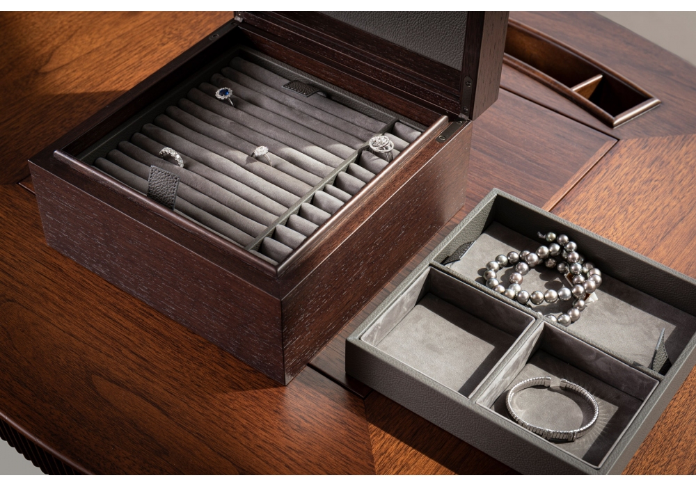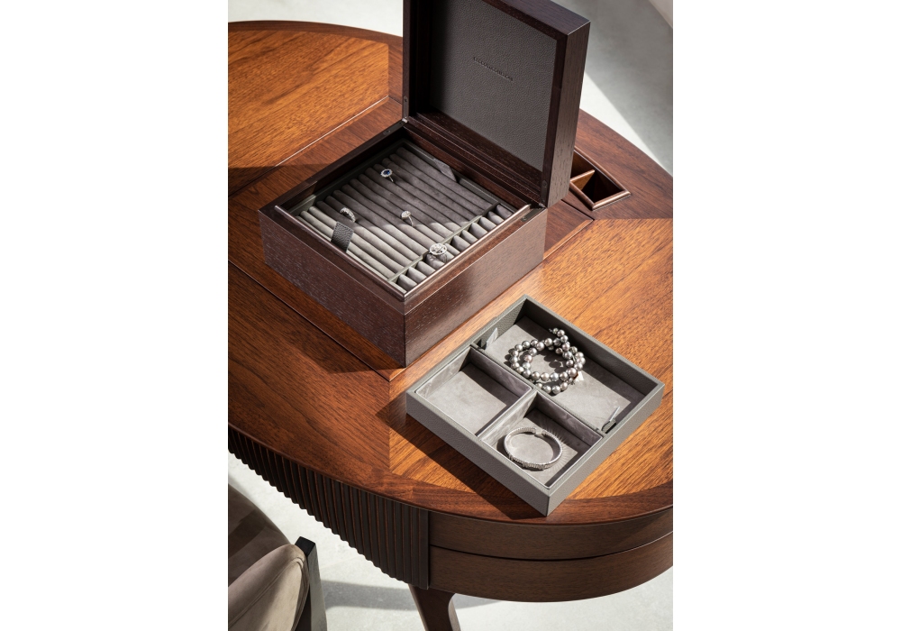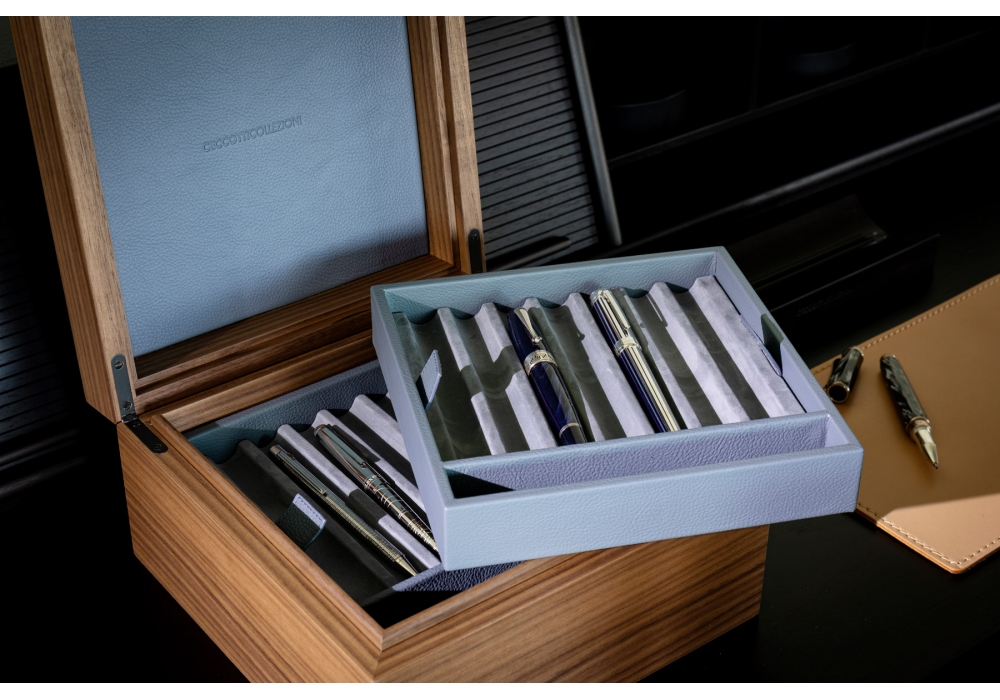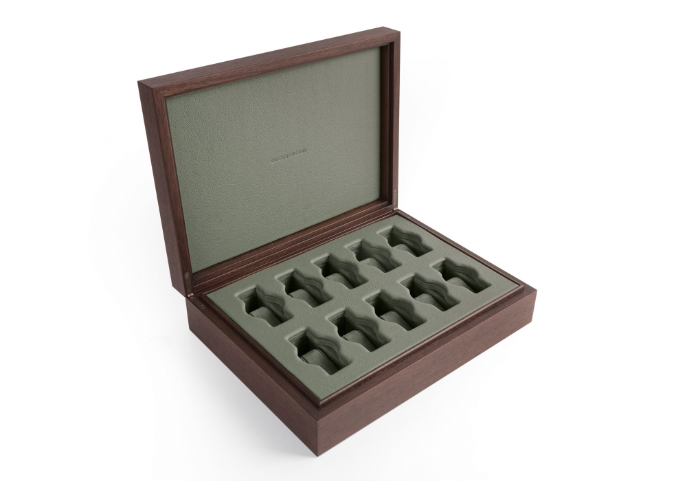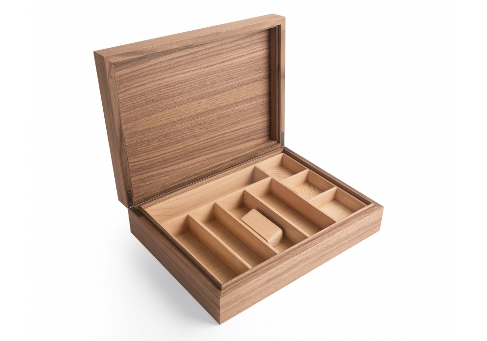 Box, entworfen von Studio Ceccotti Collezioni, ist eine Sammlung von Boxen aus Sperrholz mit amerikanischem Walnussfurnier und Innenteilen aus Poltrona Frau-Leder oder libanesischer Zeder. Die Kollektion besteht aus: Make-up-Box; Humidorboxen; Schuhpflegeset-Box; Brillenbox; Schmuckkästchen; Stiftkasten; Uhrenbox.