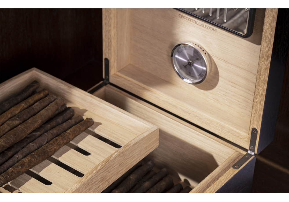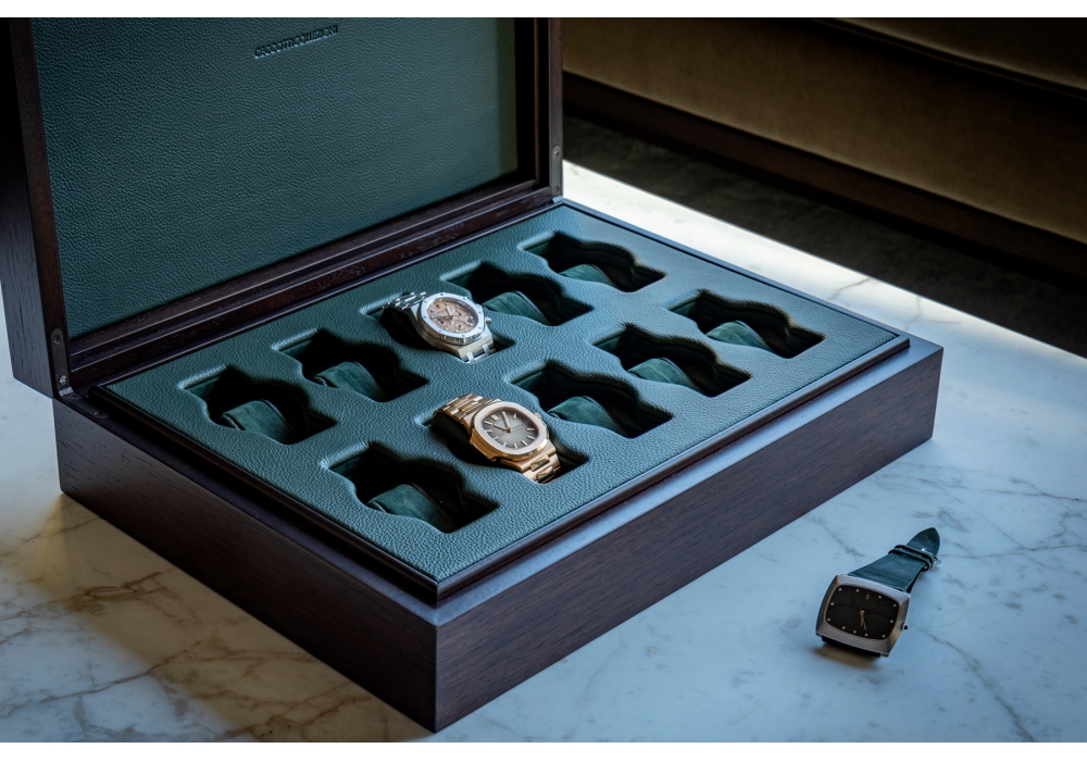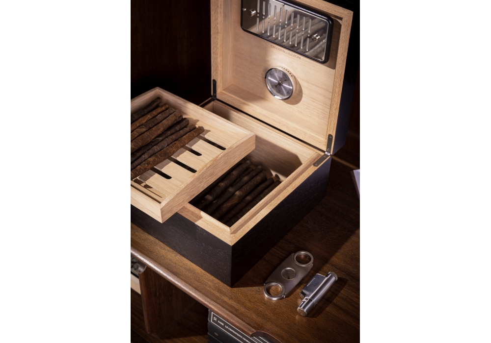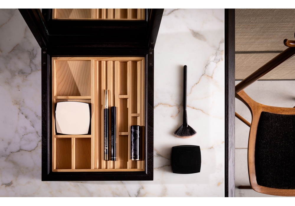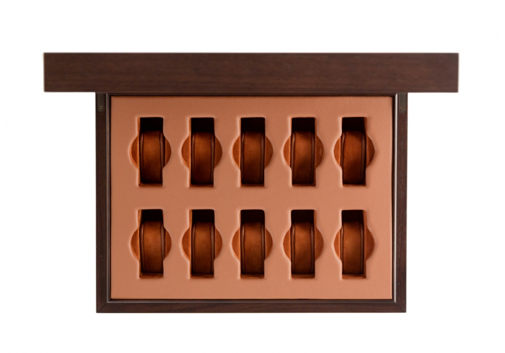 Box, entworfen von Studio Ceccotti Collezioni, ist eine Sammlung von Boxen aus Sperrholz mit amerikanischem Walnussfurnier und Innenteilen aus Poltrona Frau-Leder oder libanesischer Zeder. Die Kollektion besteht aus: Make-up-Box; Humidorboxen; Schuhpflegeset-Box; Brillenbox; Schmuckkästchen; Stiftkasten; Uhrenbox.