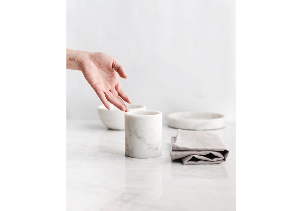 Sempre Dopo i Pasti - Hoher Zylindrischer Behälter von MarmoLove ist ein Behälter/Zahnbürstenhalter aus 100 % geschliffenem weißem Carrara-Marmor.