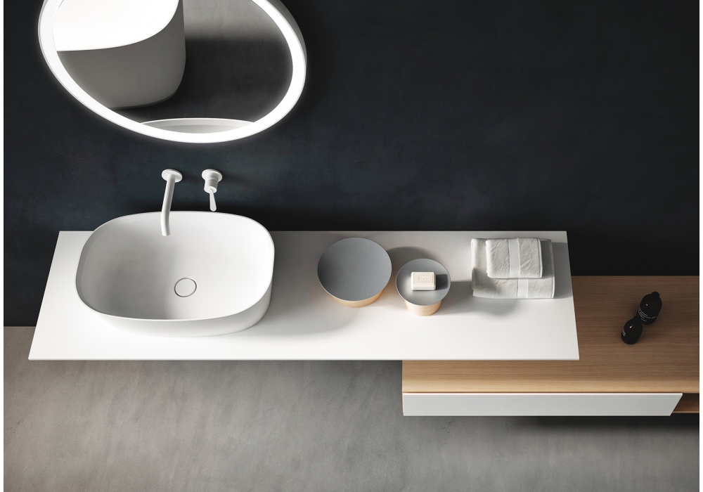 Neb von Benedini Associati für Agape entworfen, ist ein Waschbecken aus Cristalplant® biobased in verschiedenen Ausführungen. Ohne Hahnloch, mit freiem Abfluss. Komplett mit Cristalplant®-Ablaufgarnitur mit bündig mit der Innenform abschließender Kappe.