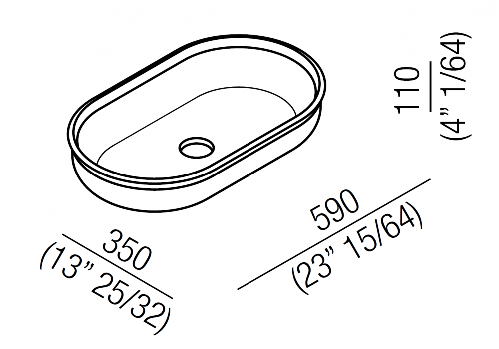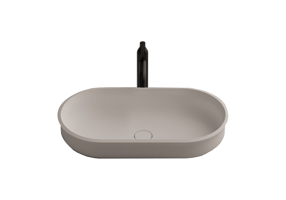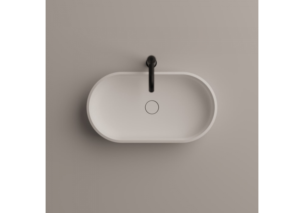Undici von Benedini Associati ist ein ovales Aufsatzwaschbecken aus weißem Solid Surface mit Thermoformverfahren. Es gibt kein Loch für den Wasserhahn, freier Abfluss. Abfluss mit passender Kappe enthalten.