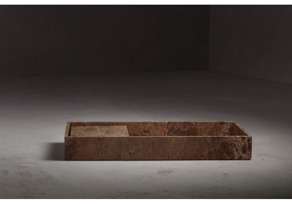 Empire von Christophe Pillet für Kreoo entworfen ist ein viereckiges Waschbecken ganz aus Marmor mit einer Ablage für Accessoires und einem versteckten Abfluss. Empire ist in verschiedenen Ausführungen erhältlich.