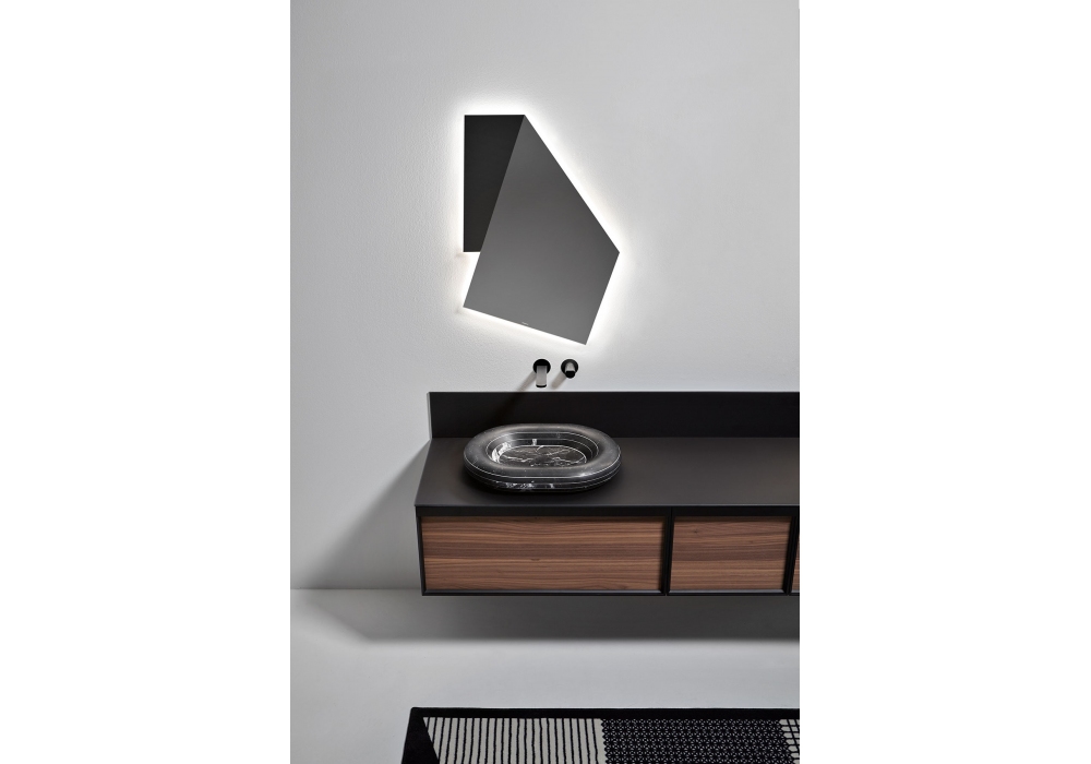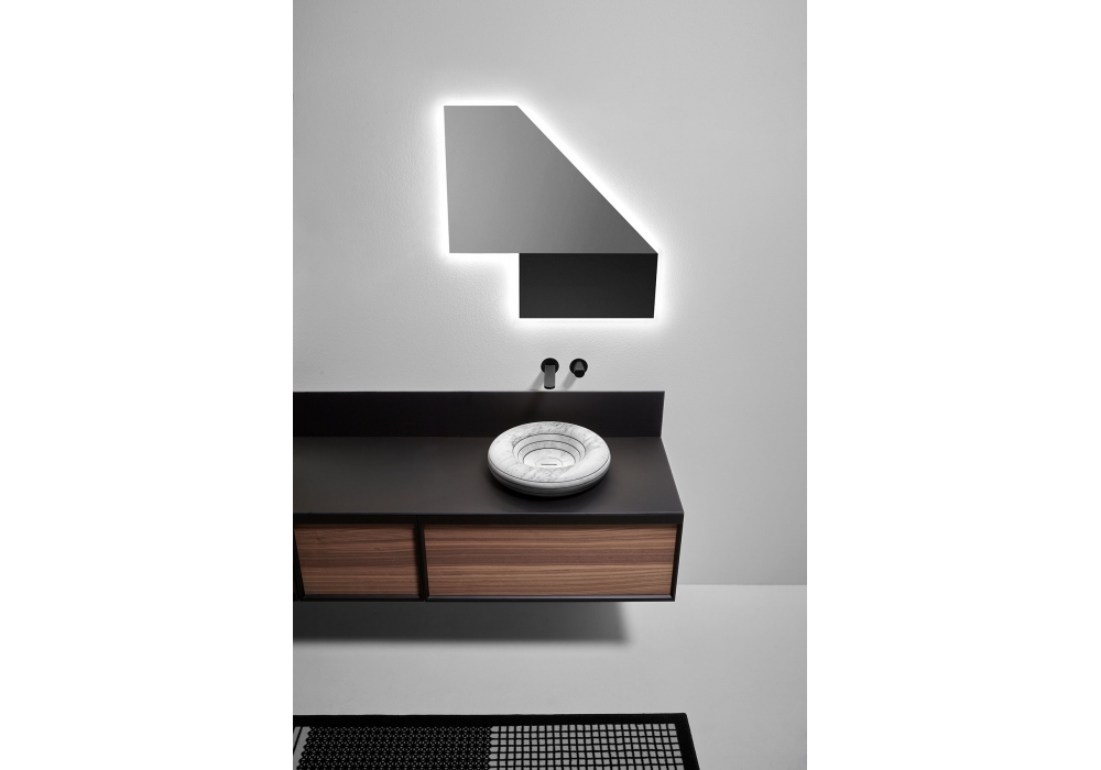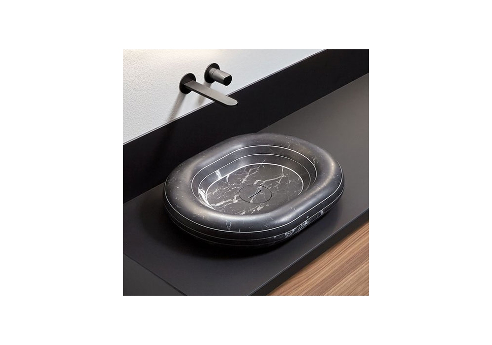 Rigati von Gumdesign für Antonio Lupi entworfen, ist ein Aufsatzwaschbecken aus Stein, komplett mit Abfluss mit offenem Ablauf und Siphonanschluss.