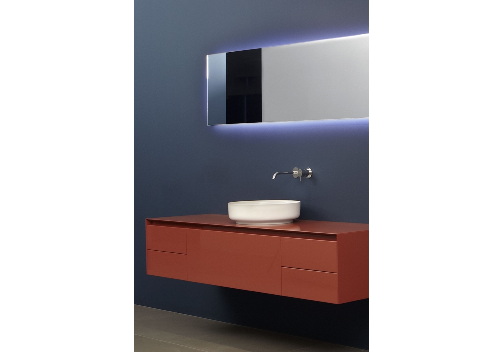Bolo von Mario Ferrarini für Antonio Lupi entworfen, ist ein Aufsatzwaschbecken aus Flumood oder Colormood, komplett mit Abfluss mit offenem Ablauf und Siphonanschluss.