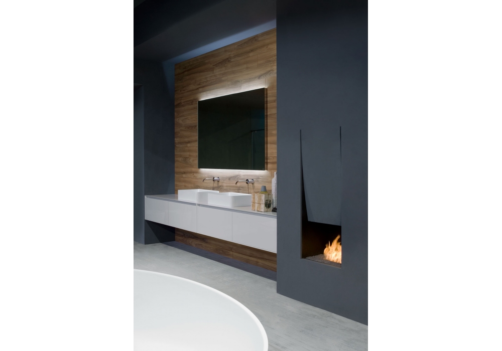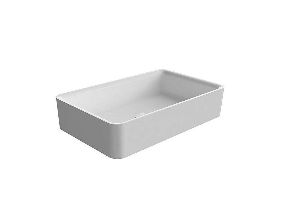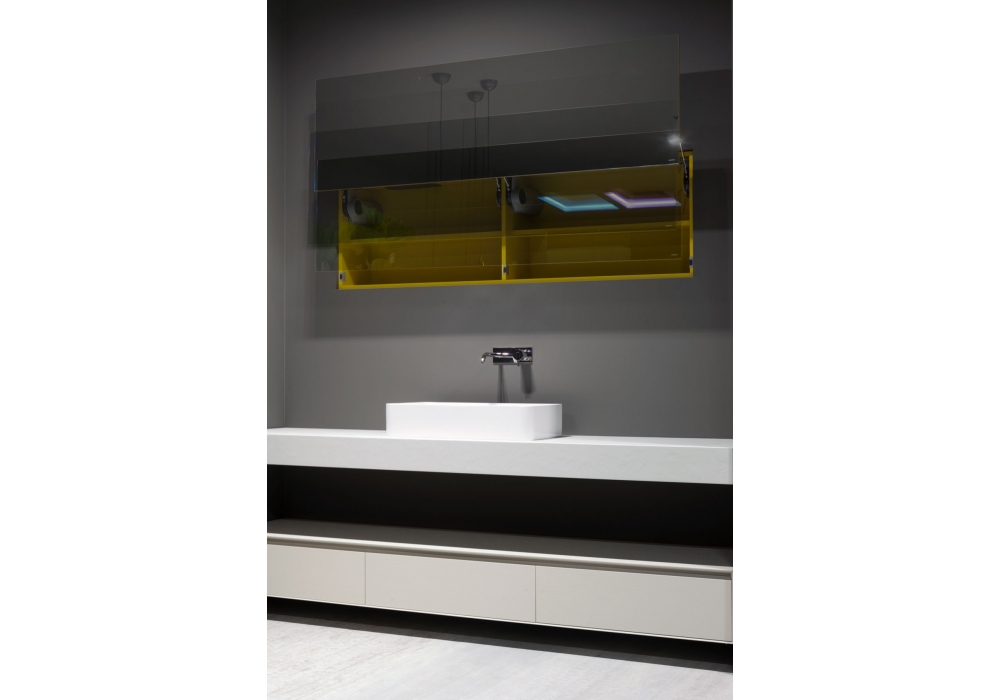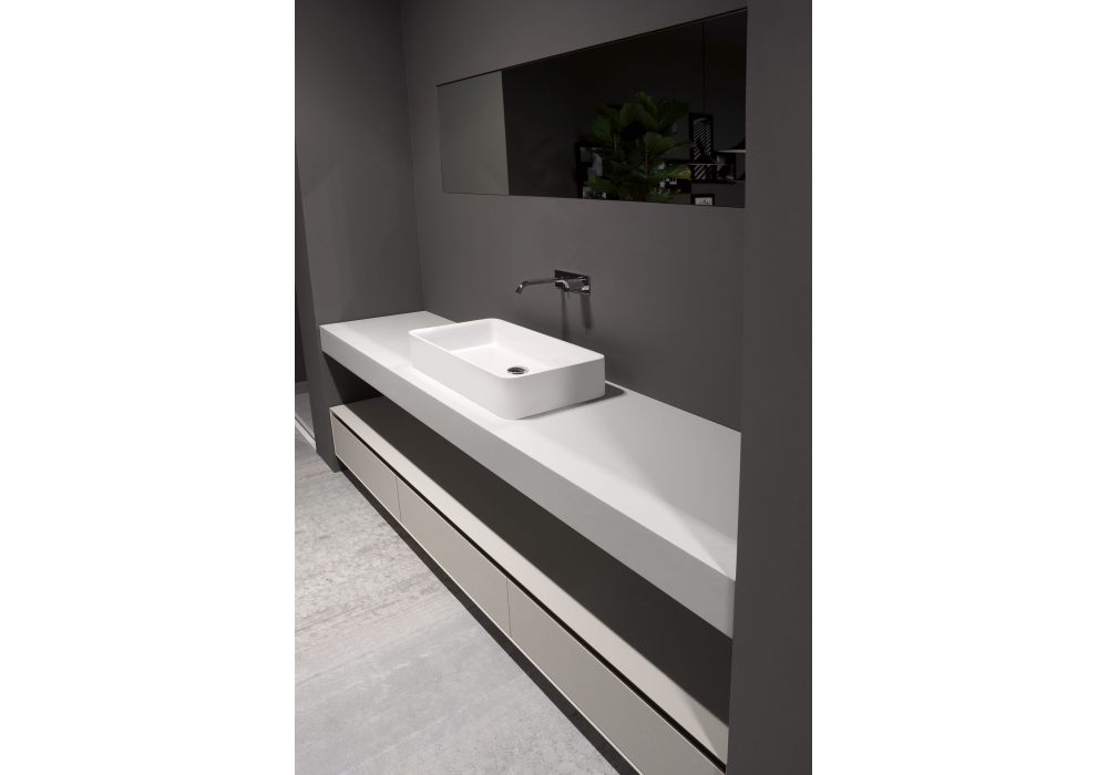 Servoretto von Mario Ferrarini für Antonio Lupi entworfen, ist ein rechteckiges Aufsatzwaschbecken in Flumood oder Colormood, komplett mit Abfluss mit offenem Ablauf und Siphonanschluss.