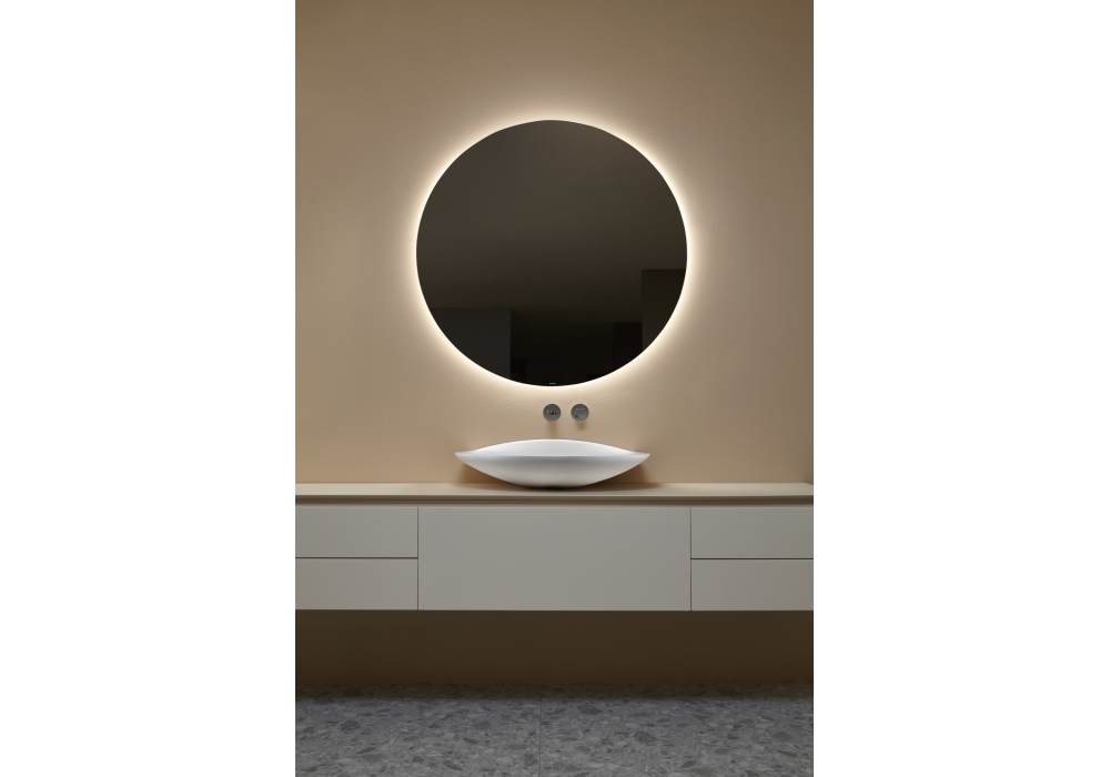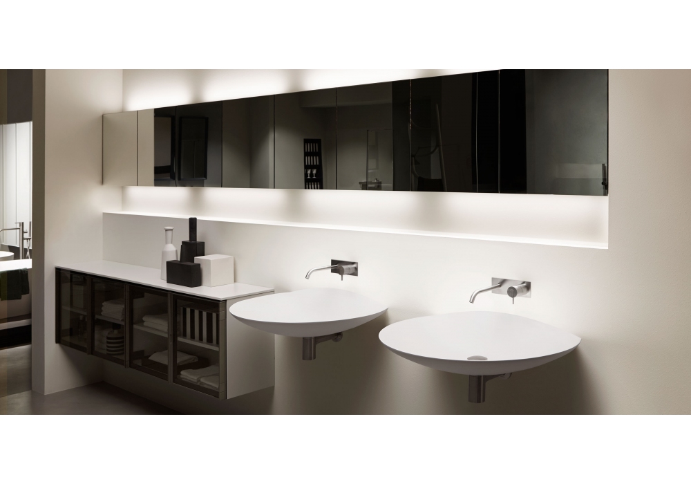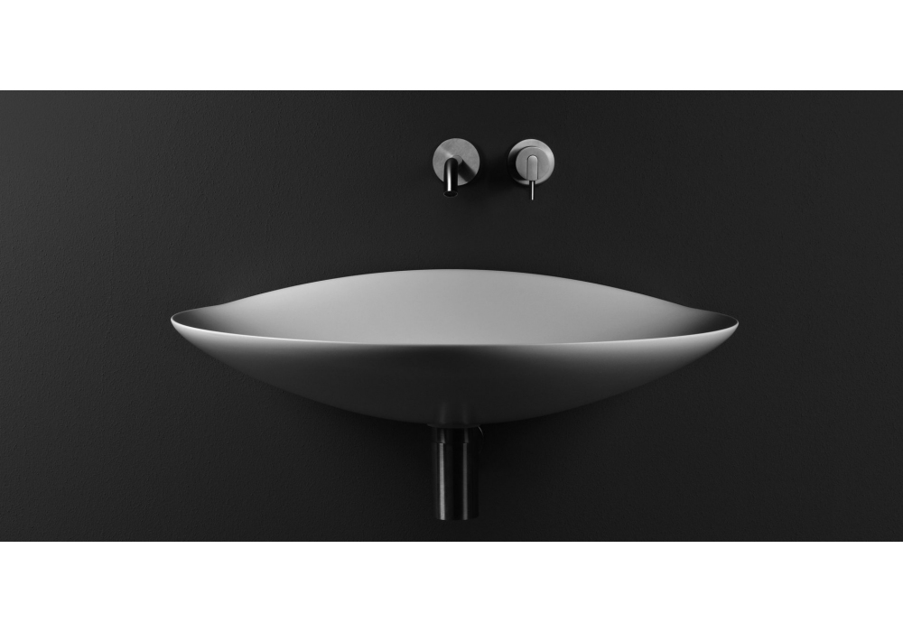Venere von Mario Ferrarini für Antonio Lupi entworfen, ist ein ovales Aufsatz- oder Wandwaschbecken in Flumood oder Colormood, komplett mit Abfluss mit offenem Ablauf und Siphonanschluss.
