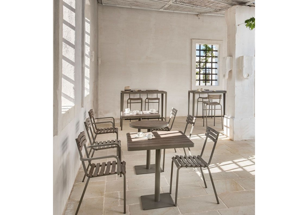 Laren von Ethimo entworfen, ist ein hoher Hocker für den Außenbereich mit Struktur aus Metall und Teakholz in verschiedenen Ausführungen.