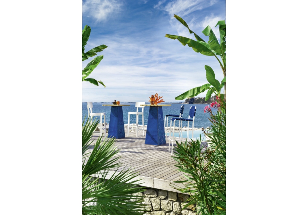 InOut von Paola Navone für Gervasoni entworfen, ist ein Hocker mit einer stapelbaren Struktur aus geprägtem, lackiertem Aluminiumrohr und einer Rückenlehne und Sitzfläche aus gewebtem elastischem Gürtel. Verfügbar in mehreren Ausführungen.