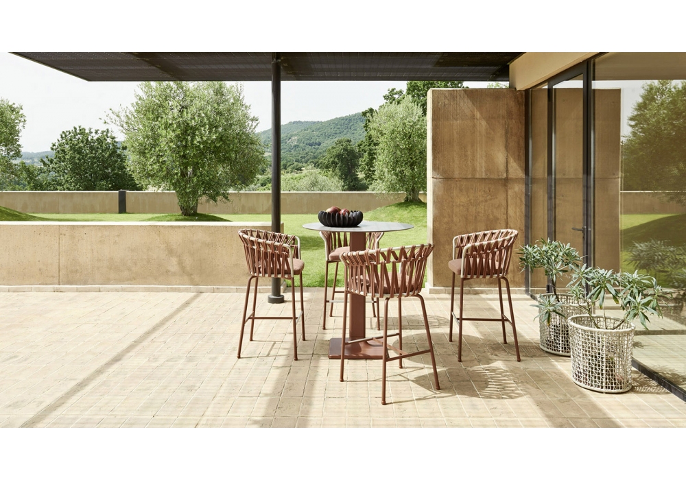 Emma Cross, von Monica Armani für Varaschin entworfen, ist ein Hocker mit pulverbeschichtetem Aluminiumgestell. Abnehmbarer Sitz mit abnehmbarem Stoff bezogen. Rückenlehne aus pulverbeschichtetem Aluminium, gewebt mit Band aus Acrylgewebe. Erhältlich in verschiedenen Ausführungen und in zwei Größen.