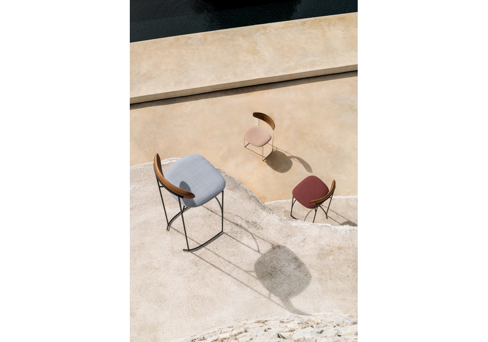 Keel Light Outdoor von M + V für Potocco entworfen, ist ein Outdoor-Hocker mit einer Struktur aus geprägtem, lackiertem Metallstab, einer Rückenlehne aus massivem Iroko und einem Sitz mit feuerhemmendem Polyurethanschaum, der mit verschiedenen Stoffen gepolstert ist, mit darunter liegender starrer Schale aus lackiertem Acryl in der gleichen Farbe und feine Prägung des Laufs.