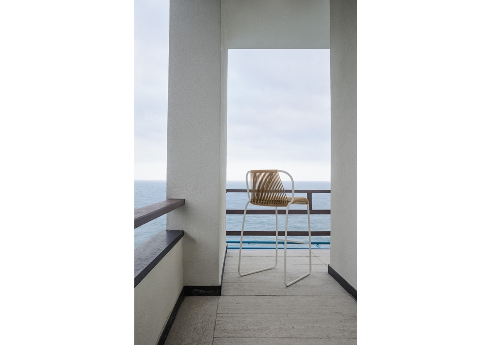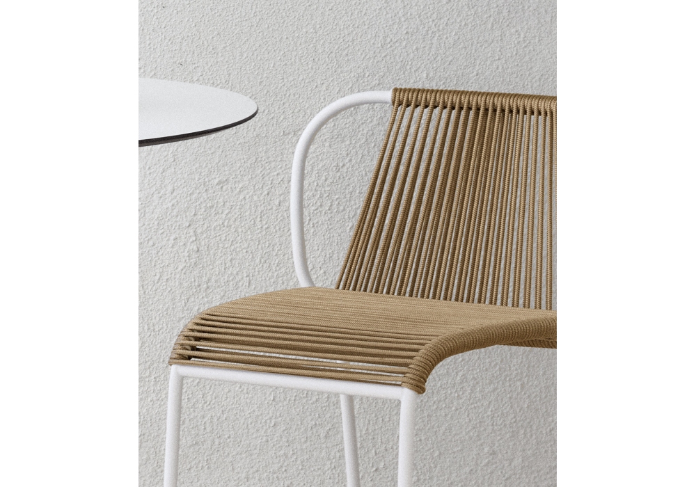 Tibes von Gregorio Facco für Potocco entworfen, ist ein Outdoor-Hocker mit einer Struktur aus epoxidpulverbeschichtetem Stahl, Sitzfläche und Rückenlehne vollständig von Hand geflochten. Es ist möglich, bis zu 4 Hocker zu stapeln.