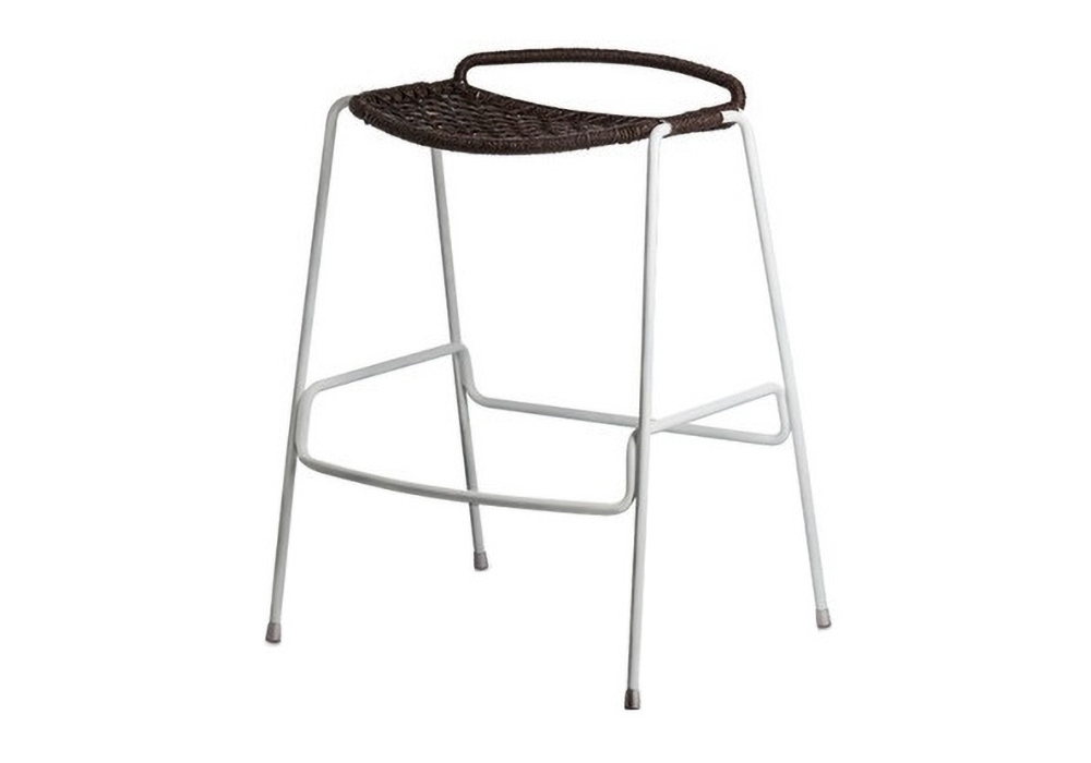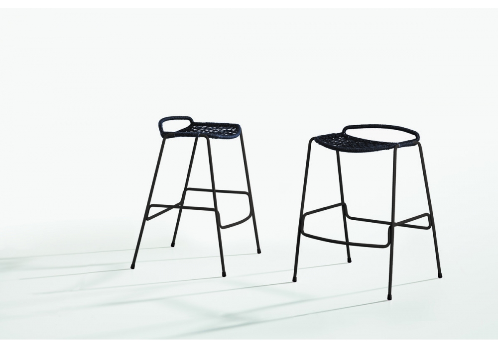 Egao von Toan Nguyen für Potocco entworfen, ist ein Outdoor-Hocker mit Beinen aus lackiertem Edelstahlrohr und Geflecht aus mokkafarbener synthetischer Kordel oder Seil.