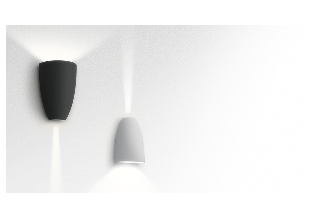 Molla von Ernesto Gismondi für Artemide entworfen ist eine abgerundete Außenwandleuchte mit lackiertem Aluminium und einer Verbundstruktur aus Technopolymer. Der Diffusor besteht aus Methacrylat und schirmt eine integrierte LED-Lichtquelle ab, die durch eine siebbedruckte Glasscheibe geschützt ist. Molla ist in verschiedenen Ausführungen erhältlich.
