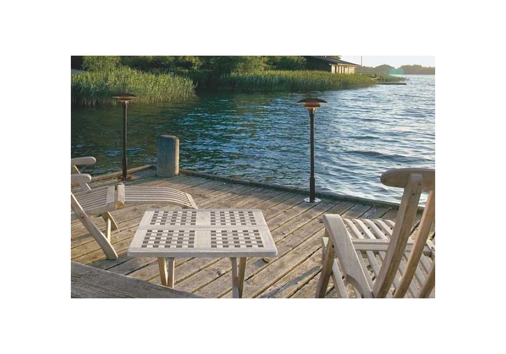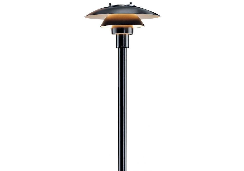 PH 3-2½, von Poul Henningsen für Louis Poulsen entworfen, ist eine Stehleuchte für den Außenbereich, die vollständig aus schwarz pulverbeschichtetem, gezogenem Edelstahl besteht. Der Diffusor besteht aus geformtem Glas und schirmt eine LED- oder Halogenlichtquelle mit E27-Fassung ab. PH 3-2½ wird mit Bodenankerplatte geliefert.