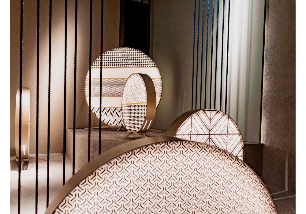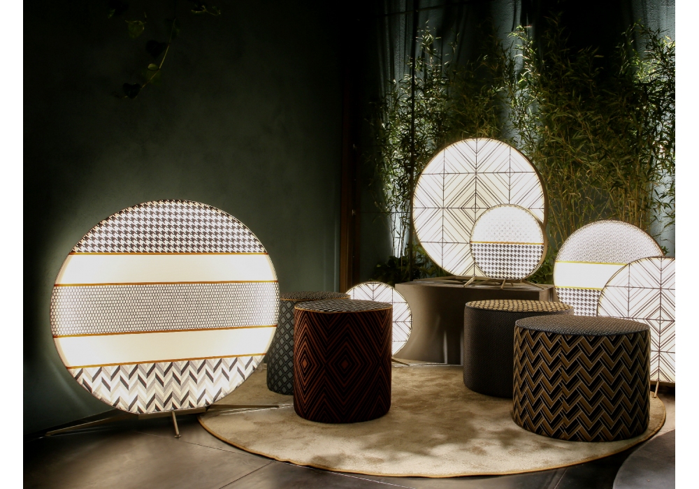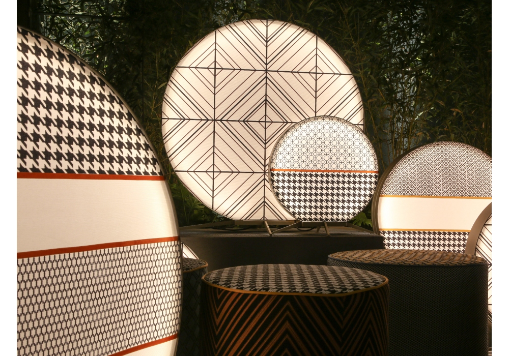 Babu von Massimiliano Raggi für Contardi entworfen ist eine Stehleuchte für den Außenbereich mit Sockel und Struktur aus champagnerfarben lackiertem Stahl mit Meereskataphorese-Behandlung. Die Vorder- und Rückseite bestehen aus Sumbrella-Stoff und Samtbesätzen für den Außenbereich. Die verwendeten Lichtquellen sind LED-Streifentypen. Diese Lampe ist in drei Größen erhältlich. Babu ist in verschiedenen Größen und Stoffausführungen erhältlich.
