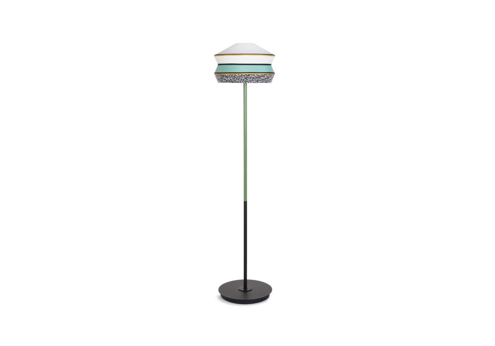 Calypso von Servomuto für Contardi entworfen ist eine Stehleuchte für den Außenbereich mit rundem Sockel und vertikalem Messingstab mit einem mattschwarzen Unterteil und einem resedagrünen Oberteil. Der Lampenschirm besteht aus kreisförmigem Stoff und nimmt eine Lichtquelle mit einer E27-LED-Fassung auf. Calypso ist in einer Version mit oder ohne Tisch und verschiedenen Lampenschirmmodellen und -ausführungen erhältlich.