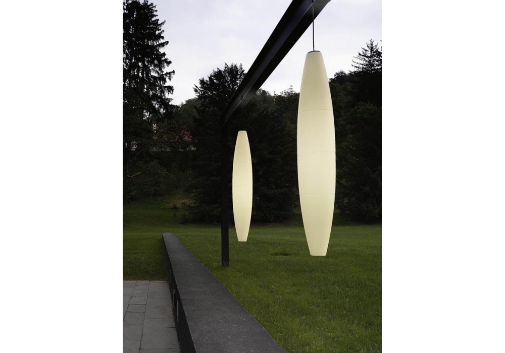 Havana Outdoor von Jozeph Forakis für Foscarini entworfen, ist eine Hängeleuchte mit Tragstruktur aus lackiertem Metall. Der Diffusor besteht aus vier Elementen aus satiniertem Polyethylen und schirmt eine LED- oder Halogenlichtquelle mit E27-Fassung ab.