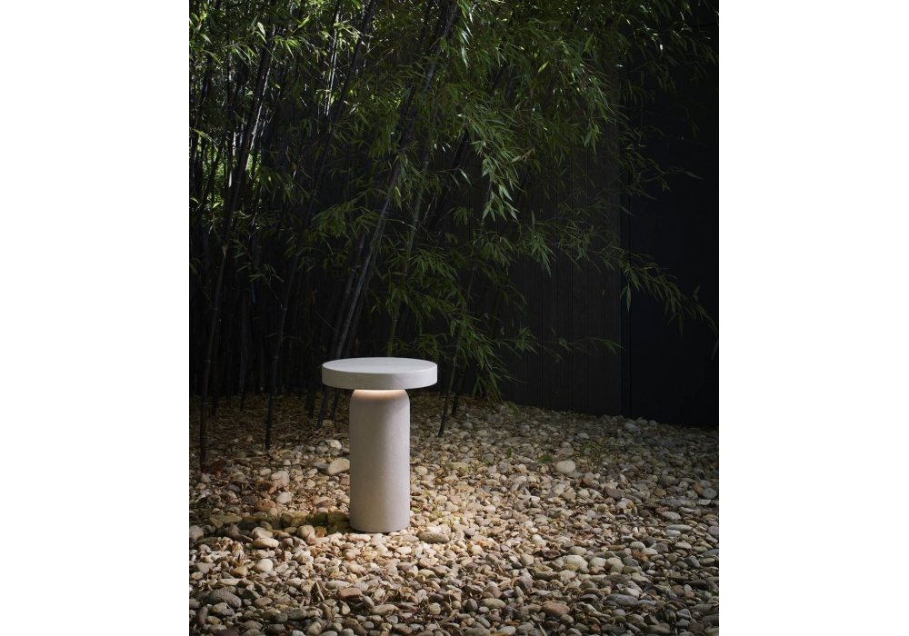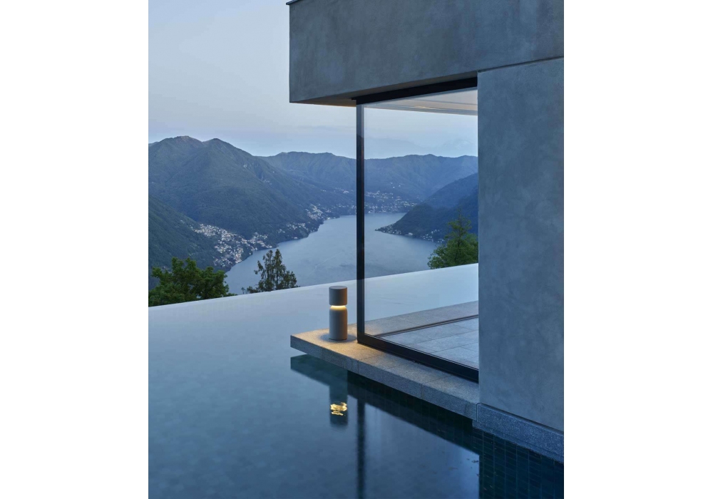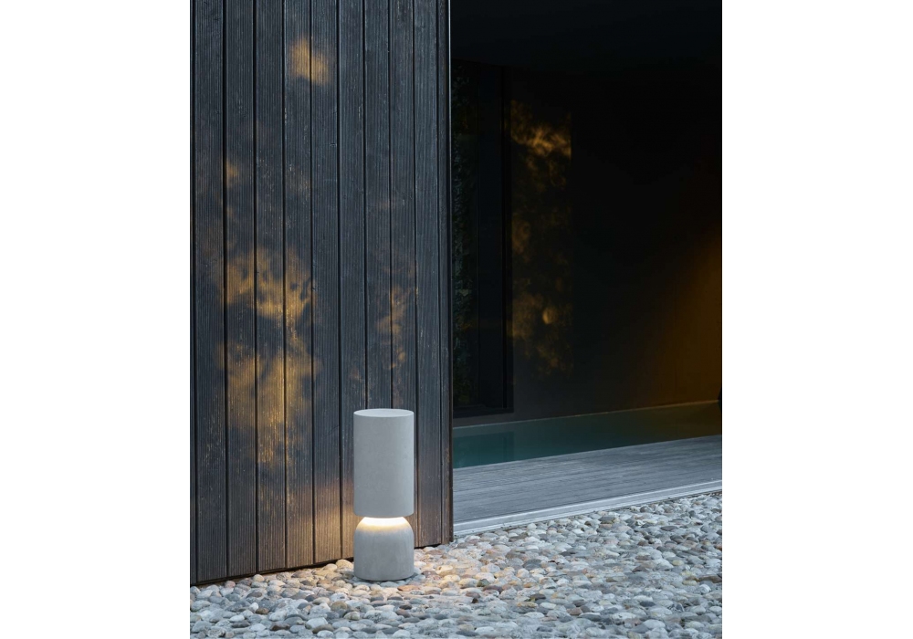Nui von Meneghello Paolelli für Luceplan entworfen, ist eine Stehleuchte aus hellgrauem Beton. Es besteht aus der Basis und dem oberen Block, der zum Gehäuse der Lichtquelle wird. Treiber ein/aus oder Push/DALI dimmbar im Lieferumfang enthalten.