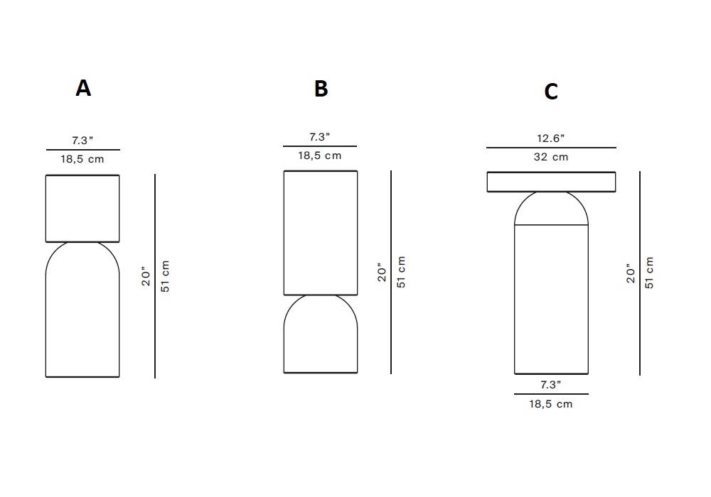 | Abmessungen | A_ Ø 18.5 x H 51 cm; B_ Ø 18.5 x H 51 cm; C_ Ø 32 x H 51 cm. |