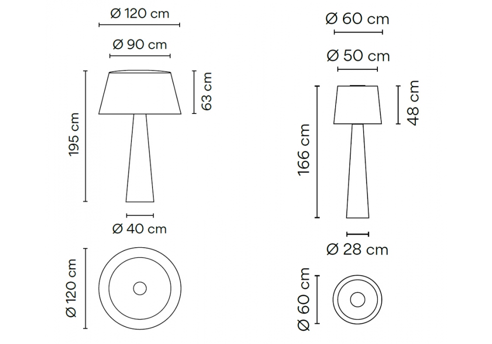| Abmessungen | Ø 120 x Ø 40 x H195 cm; Ø 60 x Ø 28 x H166 cm. |