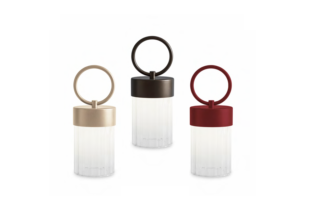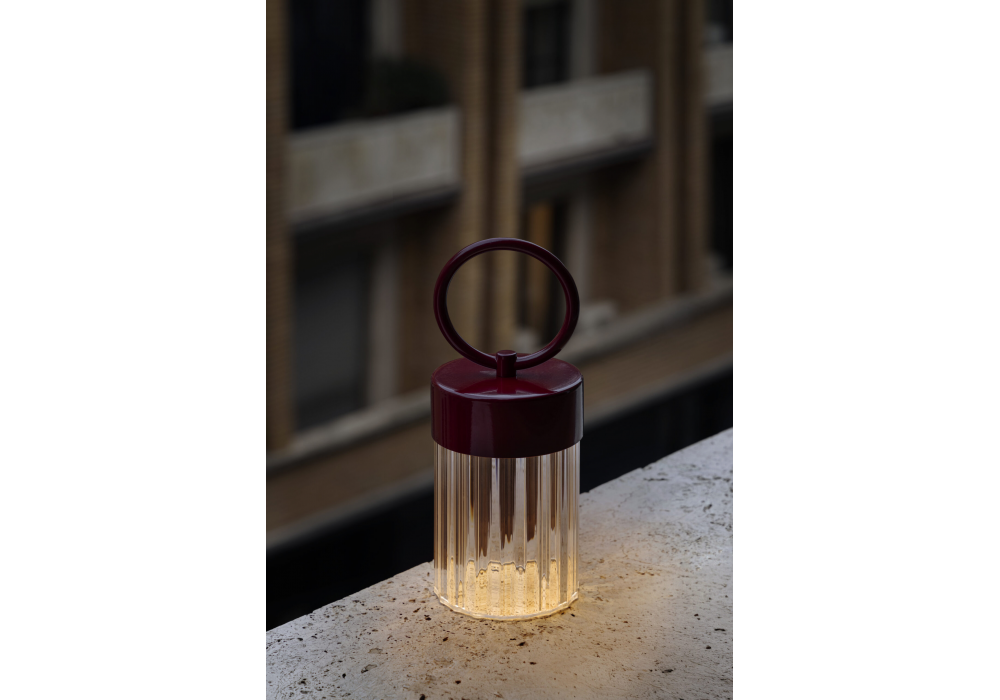 Claretta von Chiara Caberlon für Contardi entworfen, ist eine wiederaufladbare Außenleuchte mit Metallrahmen in verschiedenen Ausführungen. Der Schirm besteht aus transparentem, geripptem Plexiglas. Die Akkulaufzeit beträgt bis zu 10 Stunden, die Ladezeit 6–8 Stunden. Ein USB-Typ-C-Kabel ist im Lieferumfang enthalten; ein Netzteil ist nicht enthalten.