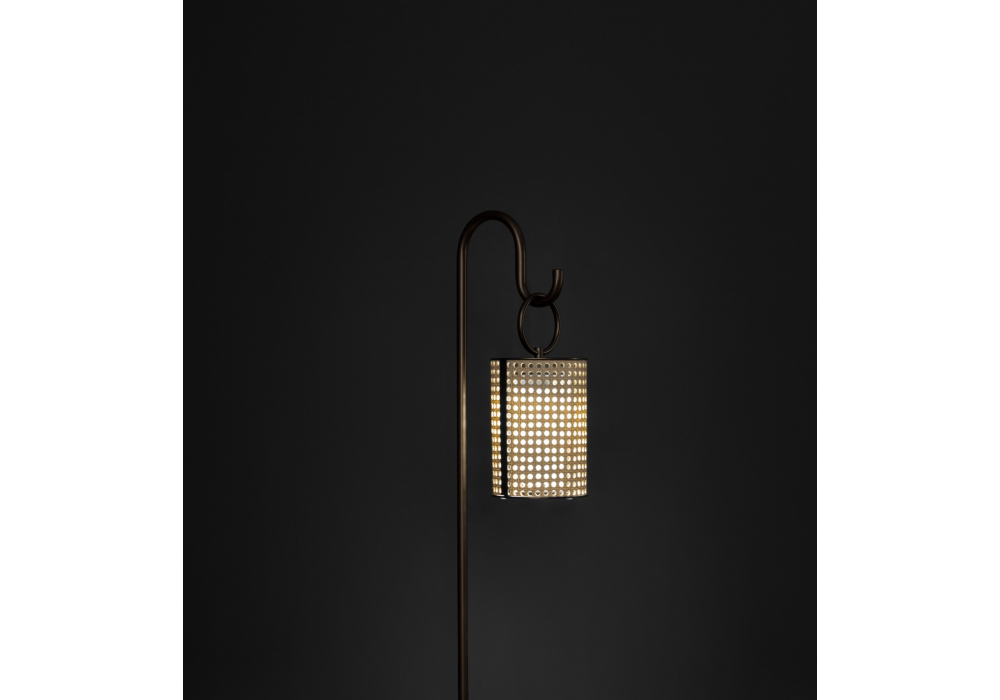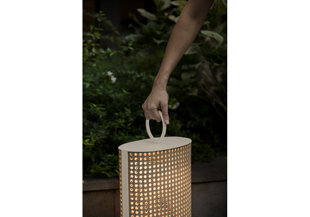 Clara Nomad von Chiara Caberlon für Contardi entworfen, ist eine Außenleuchte mit einem Diffusor aus Kunstharz in Wiener-Stroh-Optik und einem cremefarbenen oder bronzefarbenen Gestell. Sie ist witterungsbeständig und UV-beständig. Ausgestattet mit einem LED-Modul bietet sie eine Akkulaufzeit von bis zu 10 Stunden. Der Akku ist in 6–8 Stunden über das mitgelieferte USB-C-Kabel aufgeladen. Netzteil nicht im Lieferumfang enthalten.