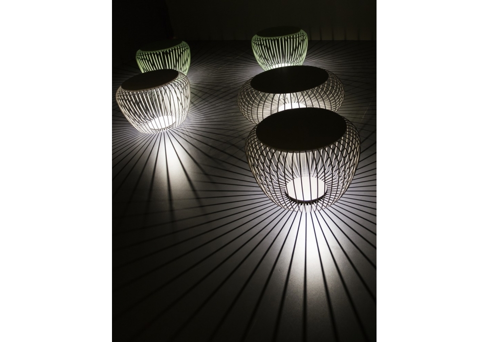 Meridiano entworfen von Jordi Vilardell & Meritxell Vidal für Vibia ist eine Stehleuchte die auch als Sitzgelegenheit oder Tisch im Freien dient. Die Struktur besteht aus lackiertem Stahl mit Sitz aus Polyurethanschaum. Der Diffusor besteht aus Glas und schirmt eine LED-Lichtquelle ab. Meridiano ist in verschiedenen Ausführungen, Modellen und Farbtönen der Lichtquelle erhältlich.