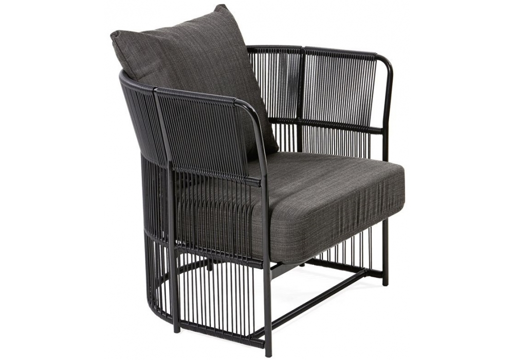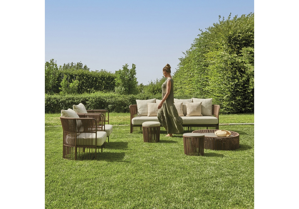 Tibidabo, von Calvi & Brambilla für Varaschin entworfen, ist ein Sessel mit pulverbeschichtetem Aluminiumrahmen mit gewebter Kunstfaserbespannung. Füße aus Polypropylen. Abnehmbare Kissen. Erhältlich in verschiedenen Ausführungen.
