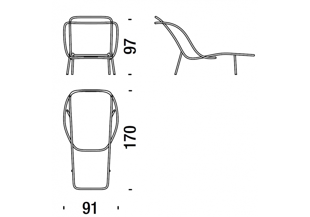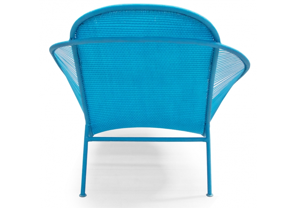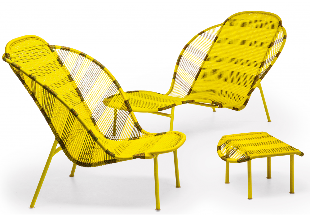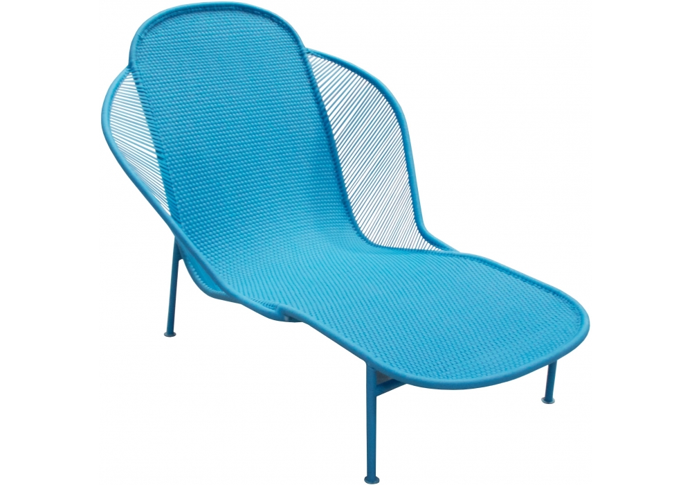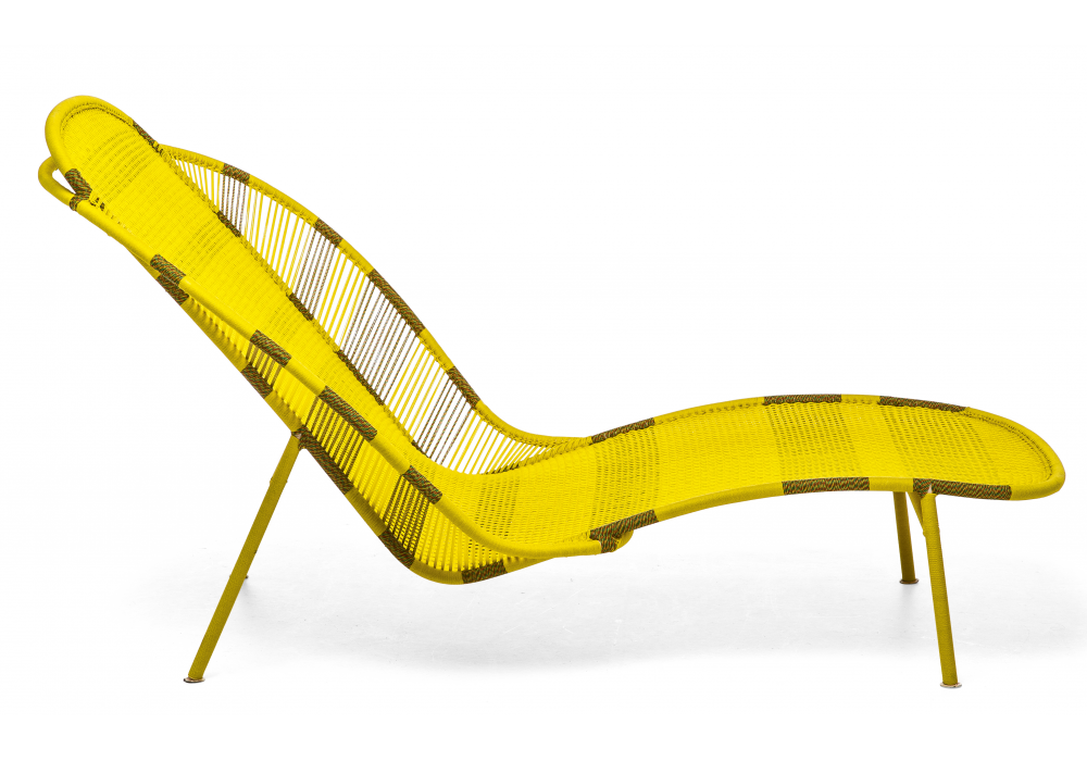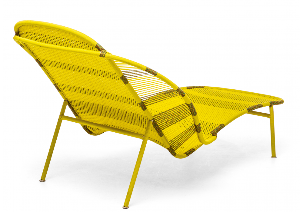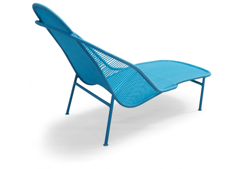 Imba von Federica Capitani für Moroso entworfen, ist eine Chaiselongue mit lackierter Stahlstruktur und farbigen handgewebten Polyethylenfäden. PVC-Einlegesohlen.