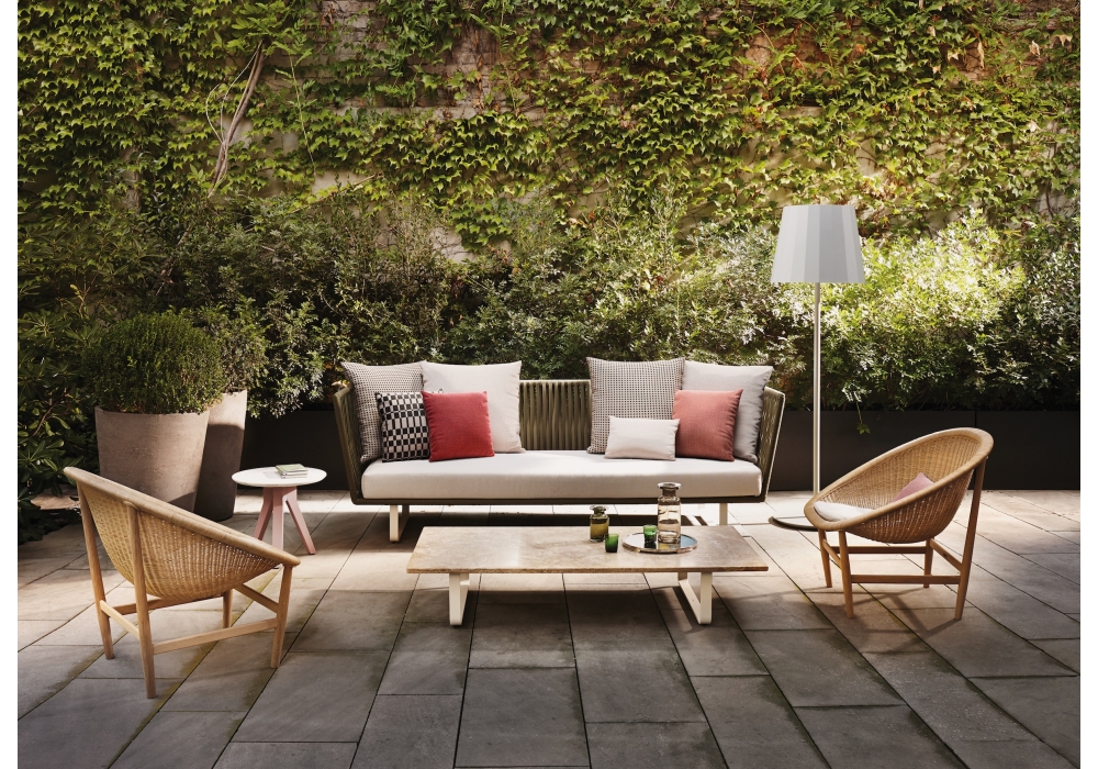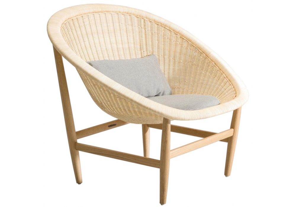 Basket Club von Nanna und Jørgen Ditzel für Kettal entworfen, ist ein Sessel für den Außenbereich. Holzstruktur aus gelbem Balau und Schale aus Kunstfaser. Sitzkissen und Rückenkissen in verschiedenen Stoffen und Farben.