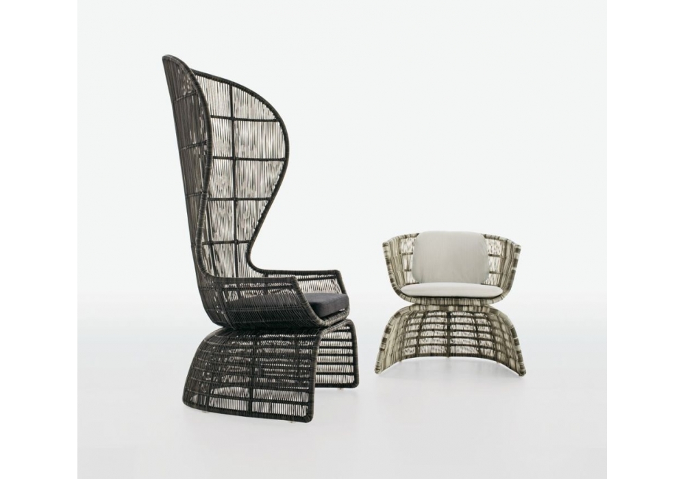 Crinoline C5P, von Patricia Urquiola für B&B Italia Outdoor entworfen, ist ein Sessel mit Gestell aus Aluminium mit Polyesterpulverlackierung. Geflecht aus Polyethylen tortorafarben. Gleiter aus Material thermoplastisch. Sitzkissen mit Bezug aus Stoff.