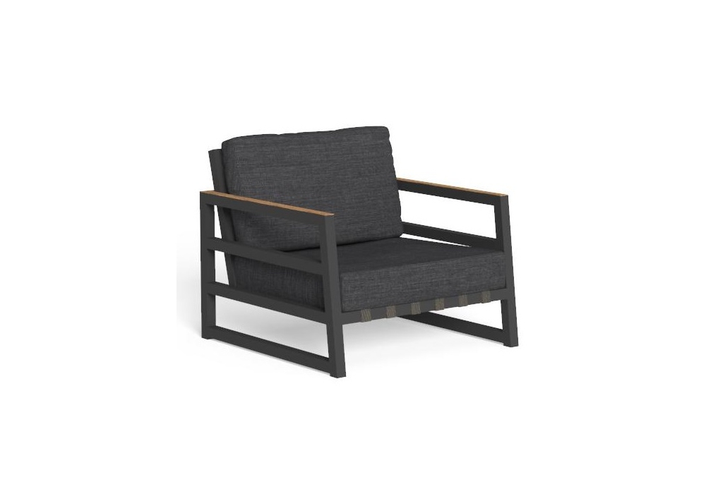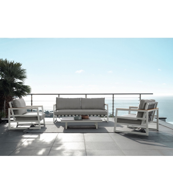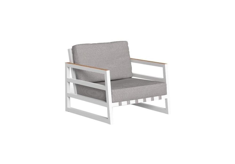 Alabama Alu ist ein Sessel, das Marco Acerbis für Talenti entworfen hat. Struktur aus pulverbeschichtetem Aluminium, erhältlich in zwei verschiedenen Farben: Weiß und Graphit. Sitz und Rückenlehne sind mit synthetischen elastischen Gurten versehen, wobei sich auf der Oberseite ein Teakstreifen befindet. Stoff in grau für die weiße und dunkelgraue Version für die Graphit-Version. Die Kissen sind aus Stoff, herausnehmbar, leicht zu waschen und resistent gegen Witterungseinflüsse.