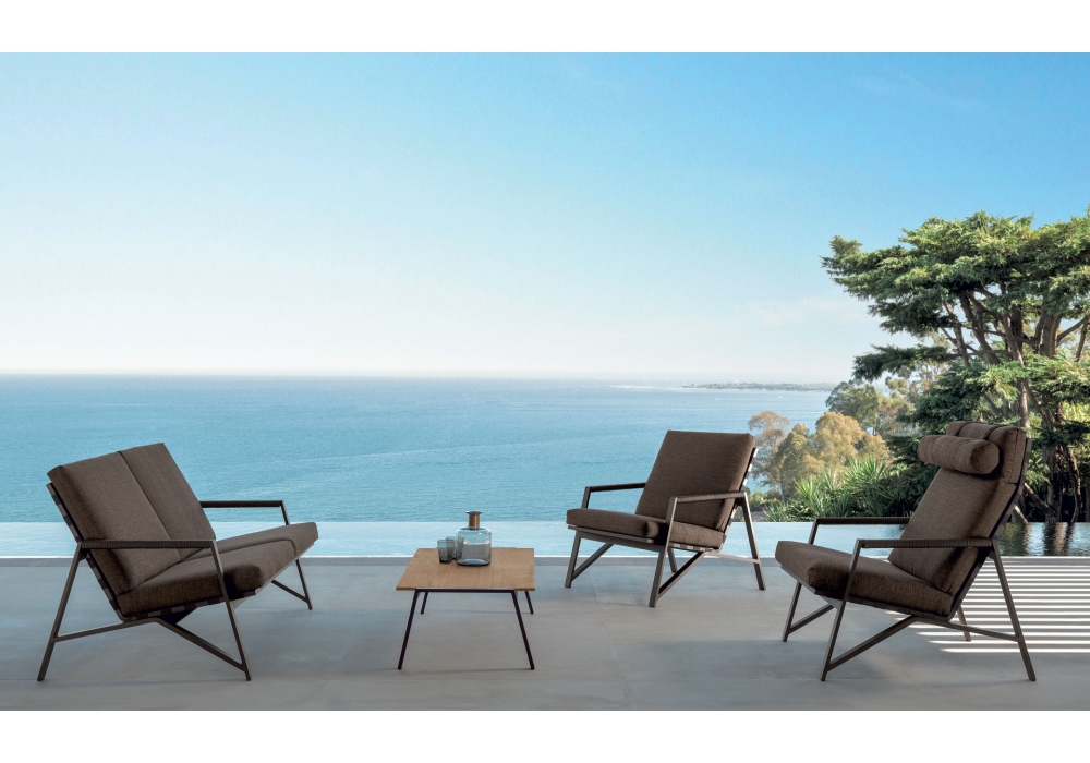 Cottage ist ein Sessel, den Ramón Esteve für Talenti entworfen hat. Pulverbeschichtete Aluminiumstruktur in verschiedenen Varianten erhältlich. Der Sitz und die Rückenlehne werden von synthetischen elastischen Bändern gestützt, die auf die Farbe der Armlehnenkordel abgestimmt sind. Herausnehmbare Kissen, leicht zu waschen und witterungsbeständig.