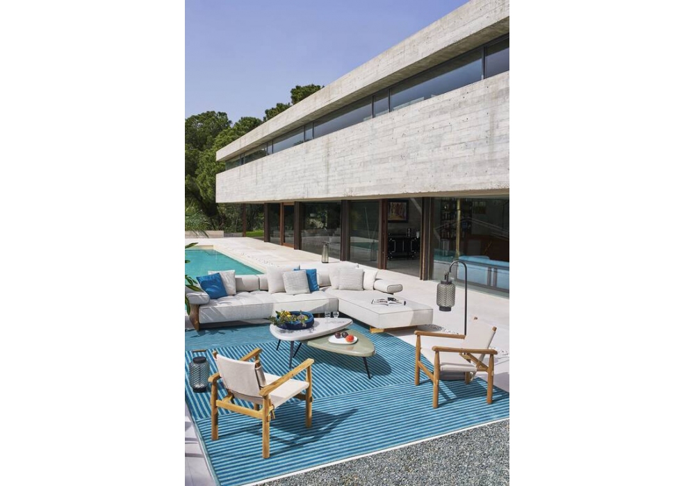 Doron Hotel Outdoor von Charlotte Perriand für Cassina entworfen, ist ein Sessel mit Struktur aus Teakholz massiv, Natürliches Finish. Polsterung Sitzfläche aus Polyurethanschaum mit Bezug aus wasserfestem Stoff.