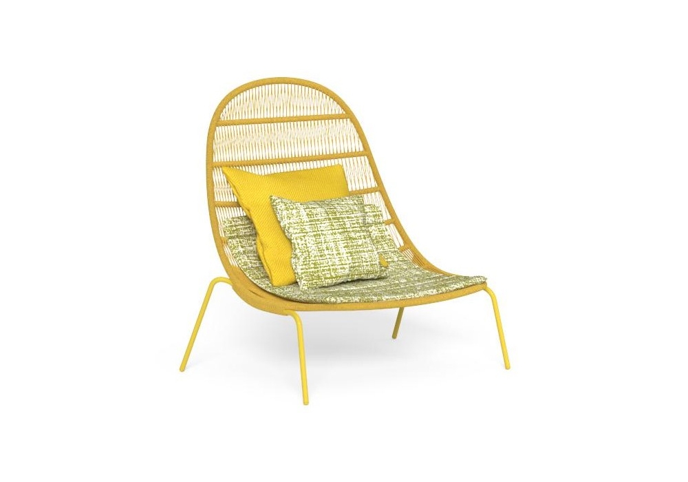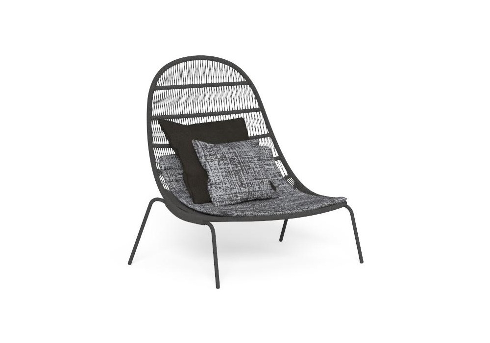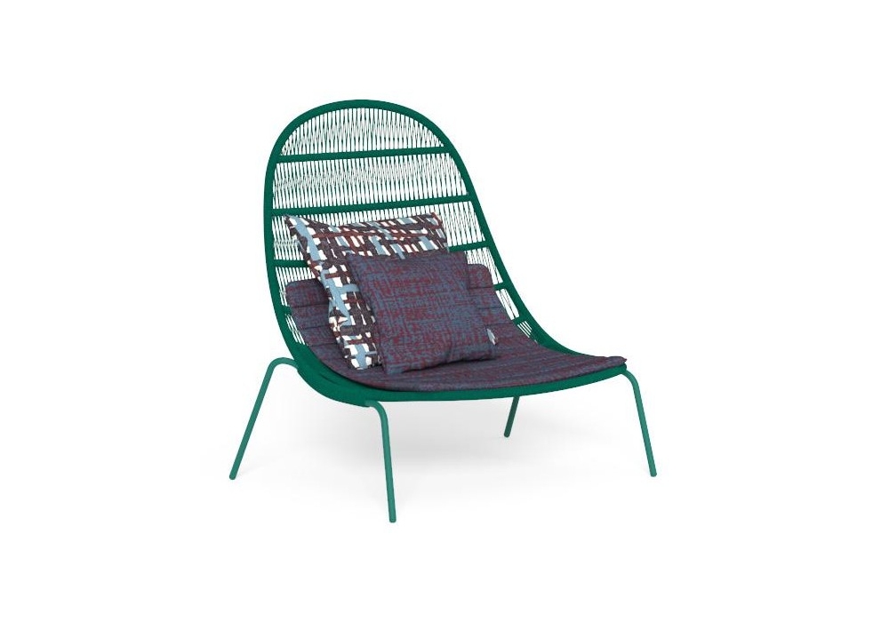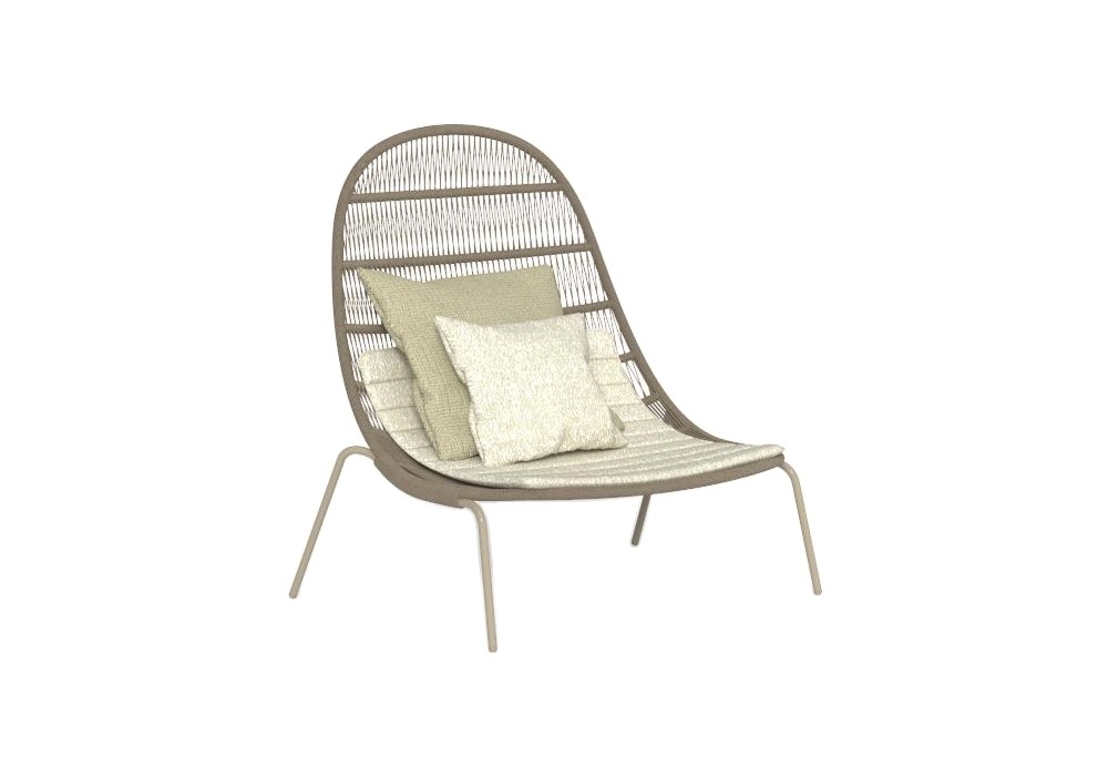 Panama Lounge, entworfen von Ludovica und Roberto Palomba für Talenti, ist ein Sessel mit Aluminiumstruktur und synthetischem Seeseil, erhältlich in verschiedenen Farben, Sitzkissen und optionalen Dekorationen in verschiedenen Ausführungen.