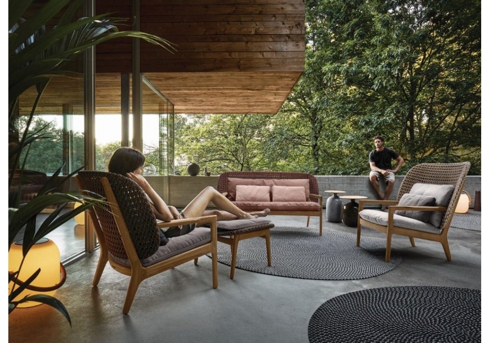 Kay von Henrik Pedersen für Gloster entworfen, ist ein Lounge-Sessel mit Teakholzrahmen und Rückenlehne aus geflochtenem Korb. Outdoor-Stoff Sitzkissen enthalten. Verfügbar in 2 Größen: mit niedriger oder hoher Rückenlehne.