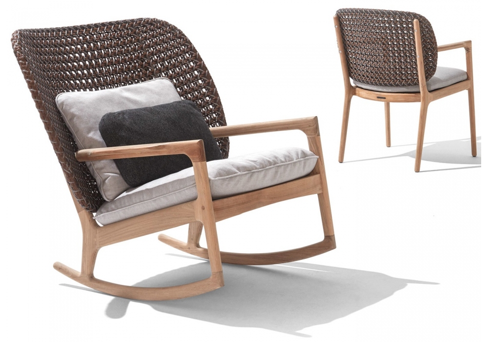 Kay von Henrik Pedersen für Gloster entworfen, ist ein Schaukelsessel mit Teakholzrahmen und Rückenlehne aus geflochtenem Korb. Outdoor-Stoff Sitzkissen enthalten. Verfügbar in 2 Größen: mit niedriger oder hoher Rückenlehne.