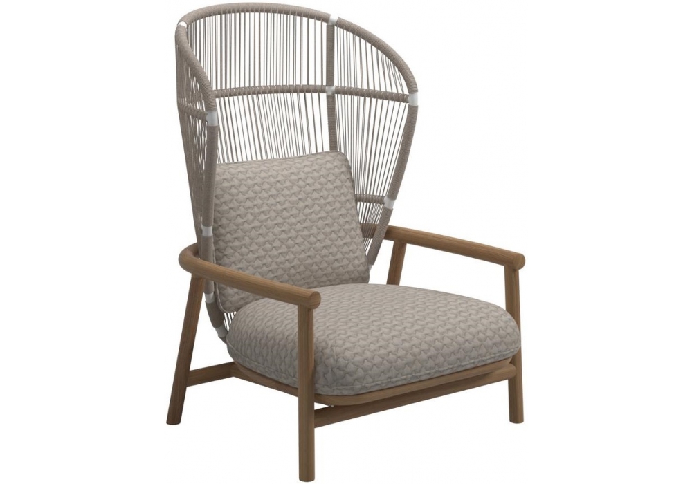 Fern von Sebastian Herkner für Gloster entworfen, ist ein Lounge-Sessel mit Teakholzrahmen und Rückenlehne aus pulverbeschichtetem Aluminium und gewebtem Seil. Outdoor-Stoff Sitz- / Rückenkissen enthalten. Verfügbar in 2 Größen: mit niedriger oder hoher Rückenlehne.