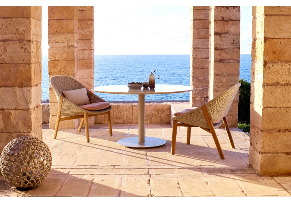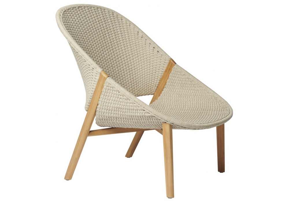 Elio von Yabu Pushelberg für Tribù entworfen, ist ein Sessel mit Teakholzstruktur und geflochtenem Tricord (Polyolefin). Erhältlich in der Version mit hohem oder niedrigem Rücken.