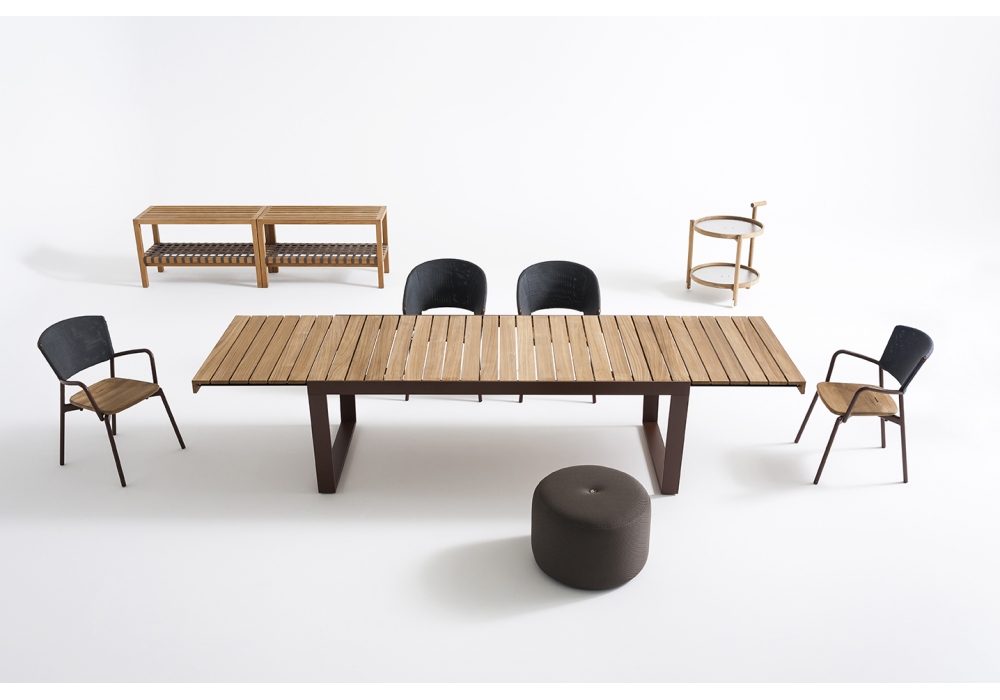 Piper 021 von Rodolfo Dordoni für Roda entworfen, ist ein Stuhl aus pulverbeschichtetem Aluminiumrohr. Gepolsterter Batyline-Rücken und Sitz aus Teakholz oder Polyurethanharz. Es ist in verschiedenen Ausführungen und Größen erhältlich.