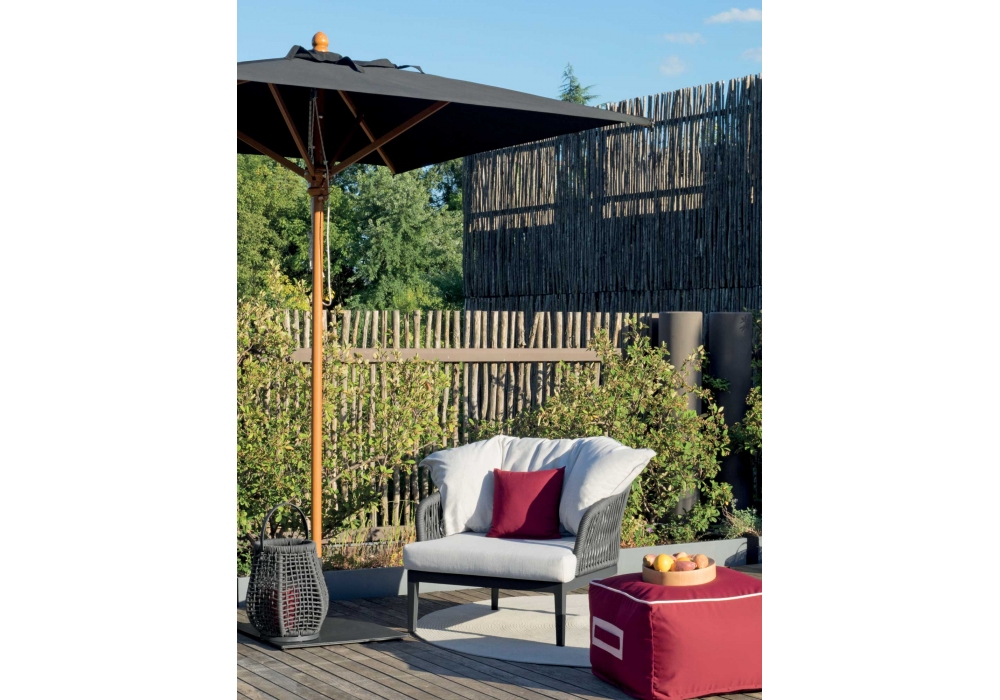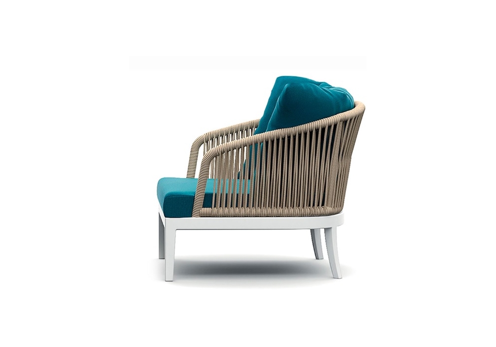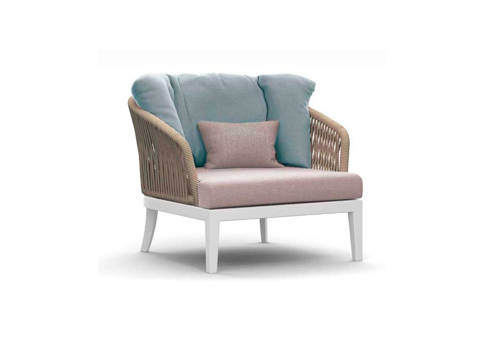 Dream 2.0 von Atmosphera entworfen, ist ein Outdoor-Sessel mit Aluminium- und Seilstruktur. Rücken- und Sitzkissen Bezug in Stoff. Auf Anfrage ist es möglich, dekorative Kissen in mehreren Abmessungen hinzuzufügen.
