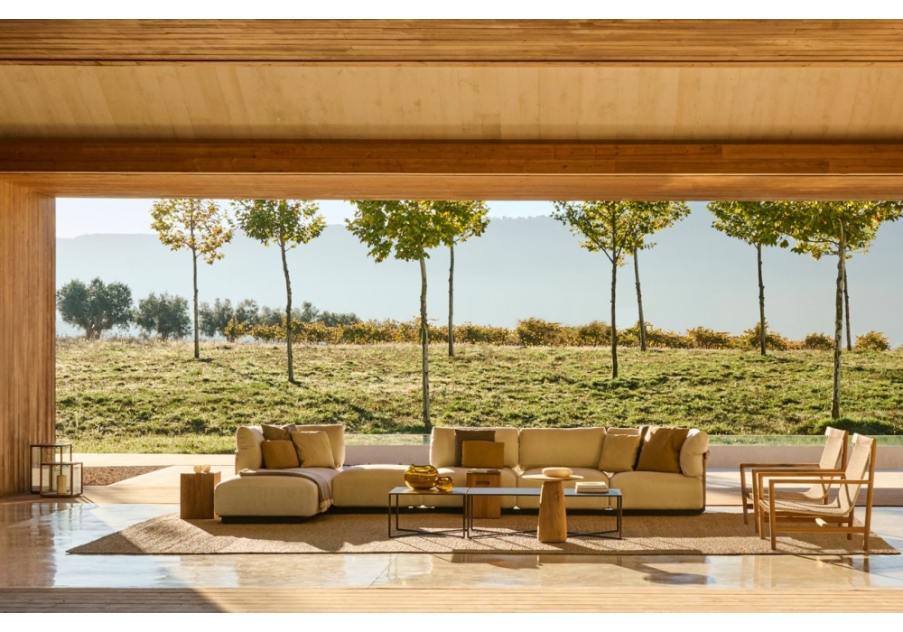 Amanu von Yabu Pushelberg für Tribù entworfen, ist ein Sessel mit Armlehnen mit Teakholzstruktur und Sitzen aus Canax, einem sehr leichten und widerstandsfähigen Material auf Hanfbasis.