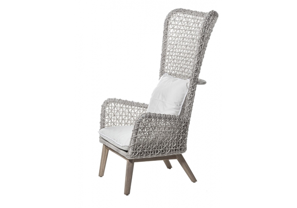 Panda von Paola Navone für Gervasoni entworfen, ist ein Bergere-Sessel mit handgewebter Aluminiumstruktur aus Panda-Harz in Weiß / Grau-Melange und Füßen aus gealtertem Teakholz. Kissen mit abnehmbarem Bezug.