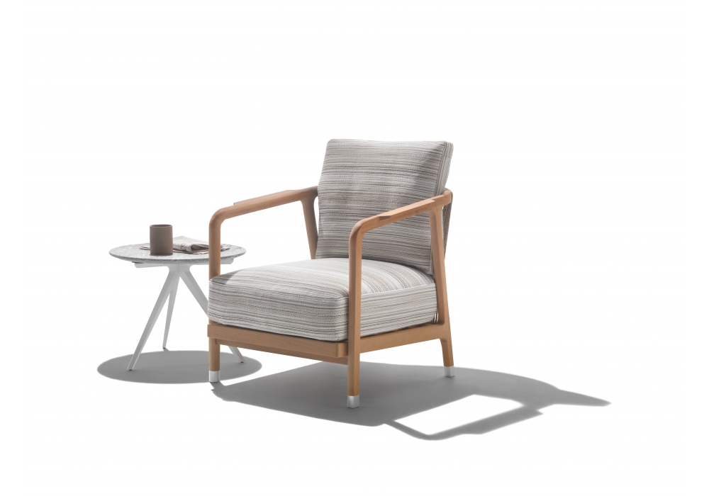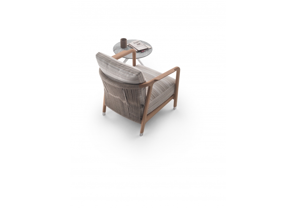 Crono Outdoor, von Antonio Citterio für Flexform entworfen, ist ein Outdoor-Sessel mit Struktur aus massivem Iroko-Holz, Schale mit handgewebtem PVC- oder Polypropylenseil und Kissenbezug aus Outdoor-Stoff.